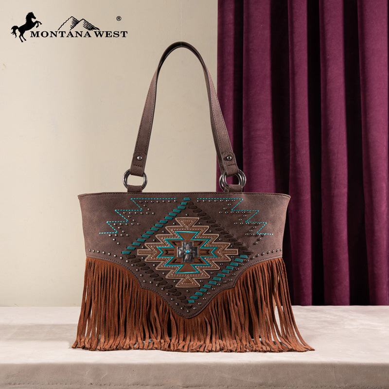 Montana West Aztec Fringe Concealed Carry Tote Bag Coffee