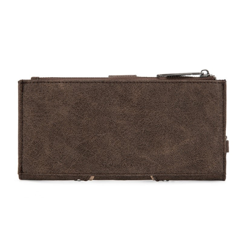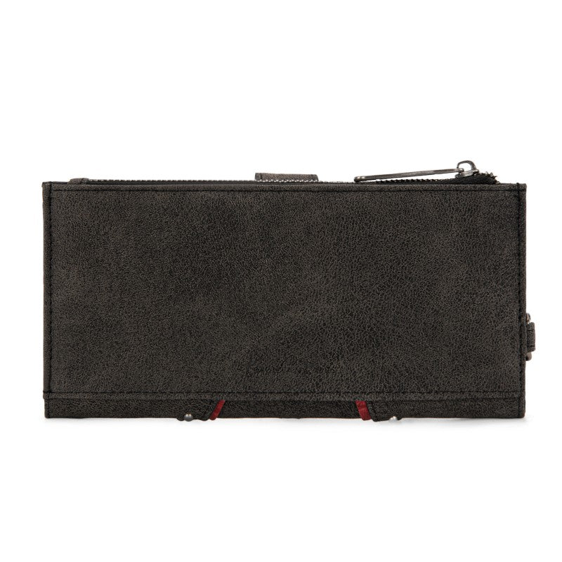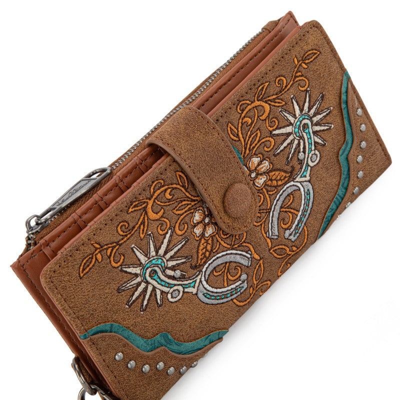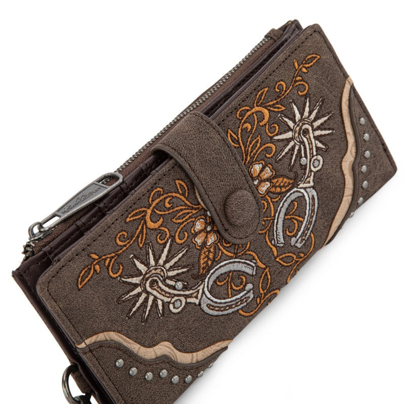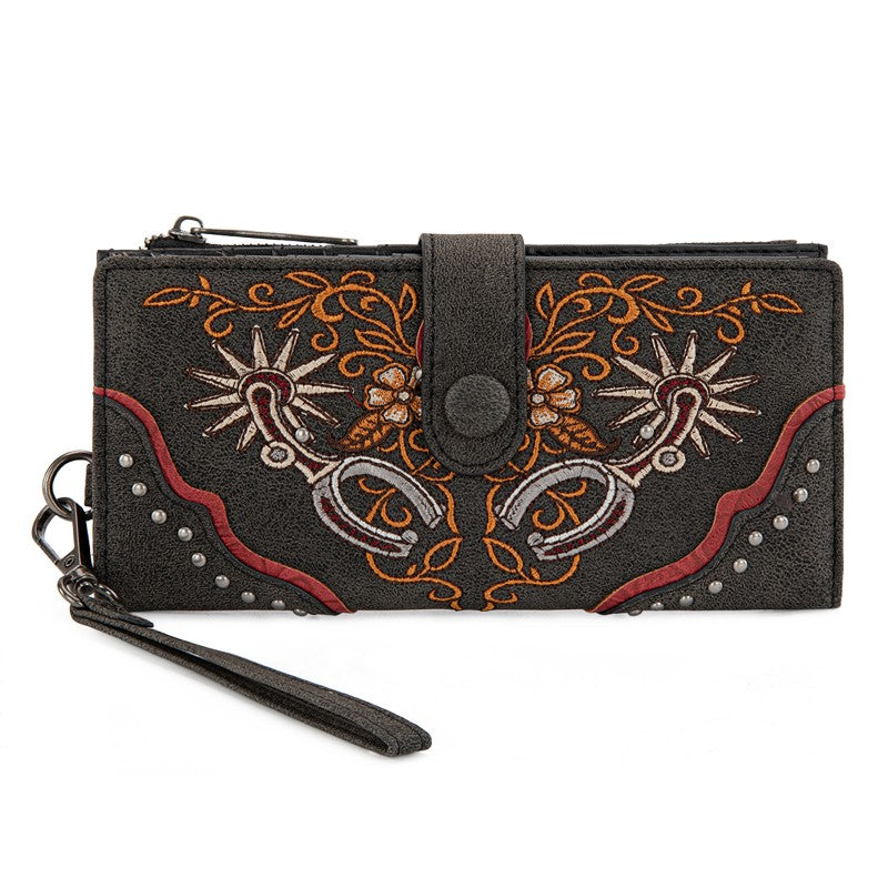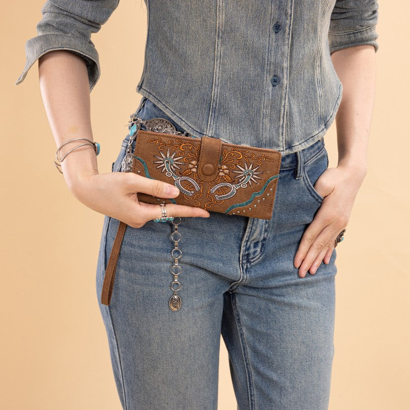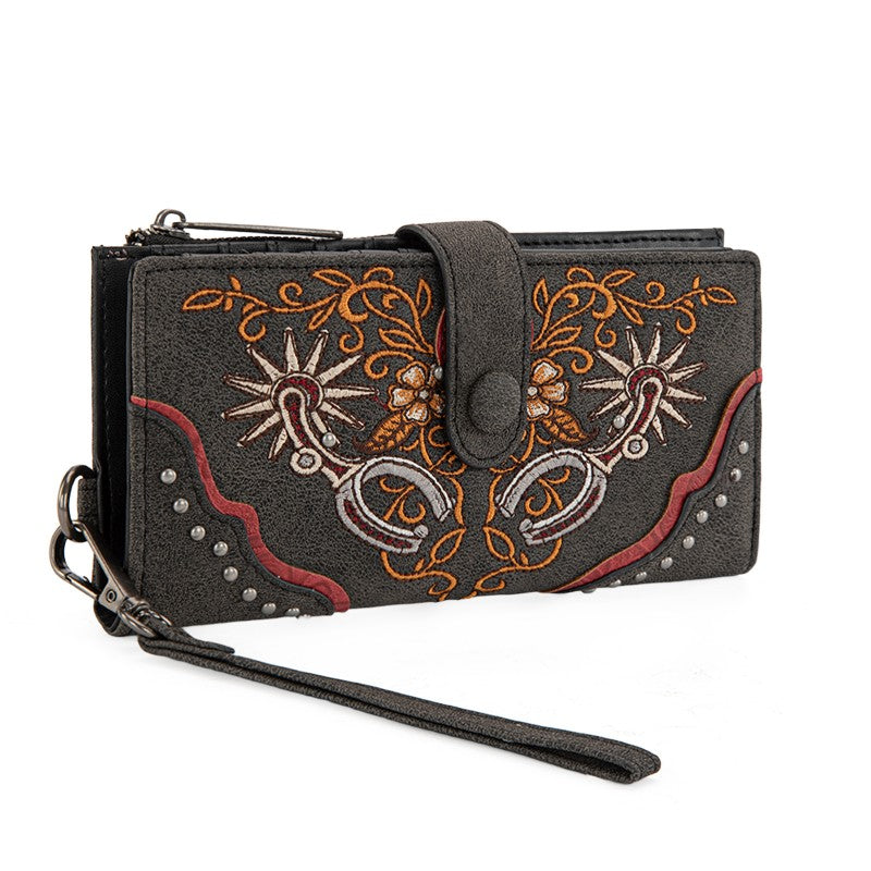 The Montana West wallet is a compact, Western-style embroidered wallet crafted from durable synthetic leather. Featuring intricate floral embroidery and a secure zip closure, this wristlet offers RFID protection for cards and cash.