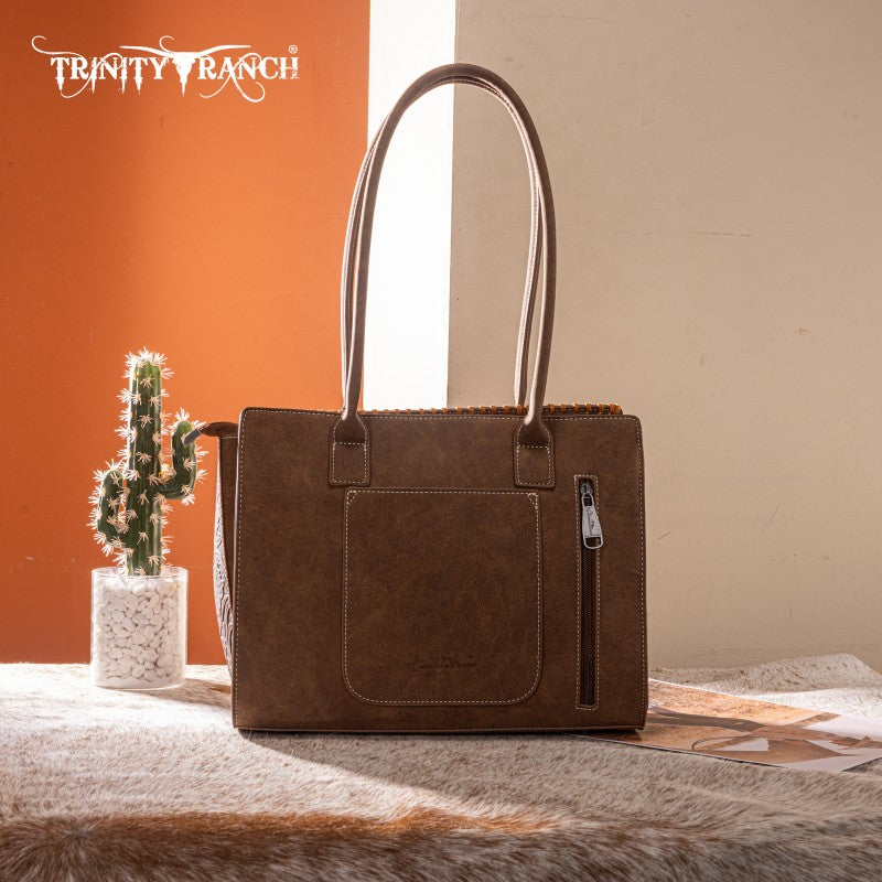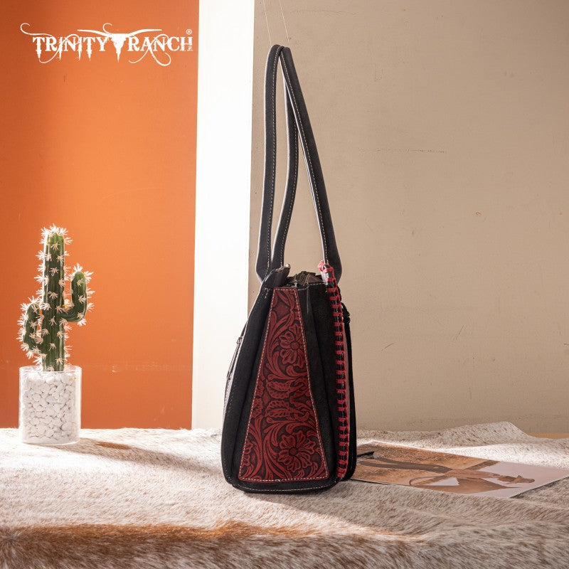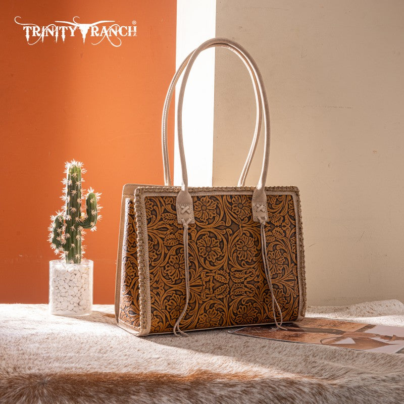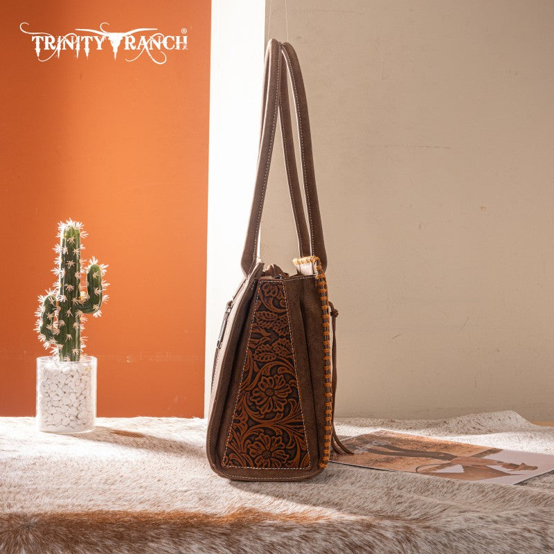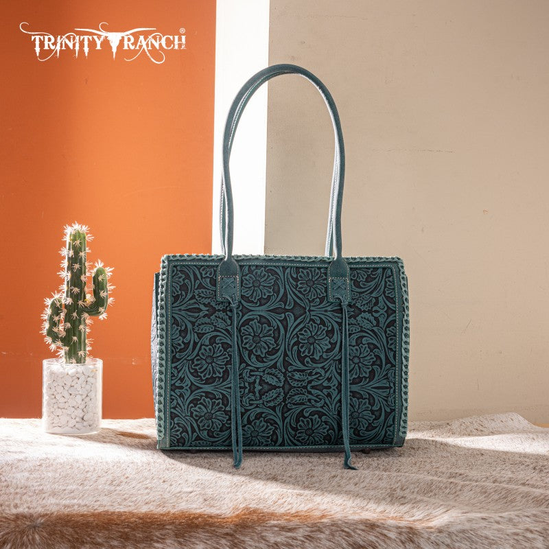 Artisanal Floral Design: Floral tooled front with hand coloring and whipstitch detailing for a unique, Fringe tassel,handcrafted aesthetic.