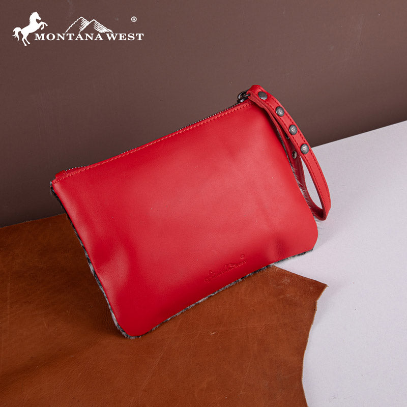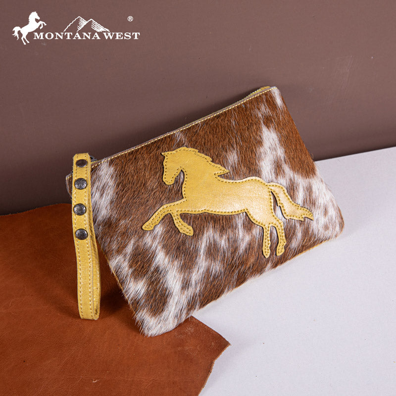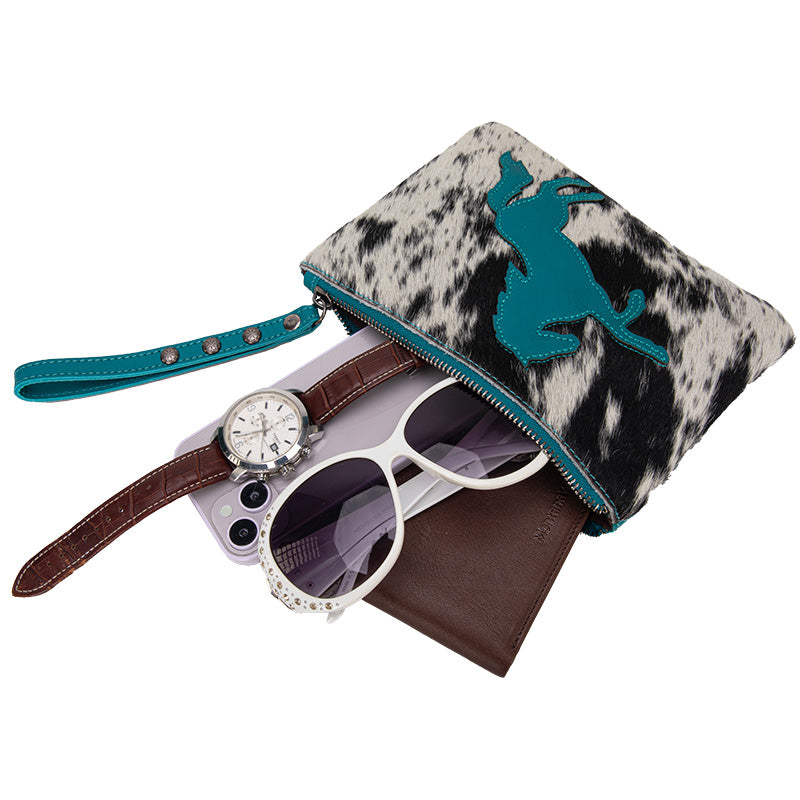 Made of leather and genuine hair-on cowhide this wristlet has:
