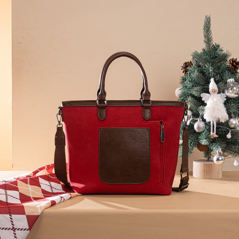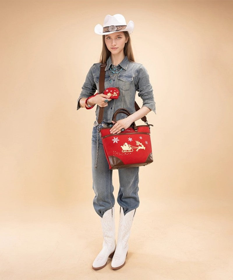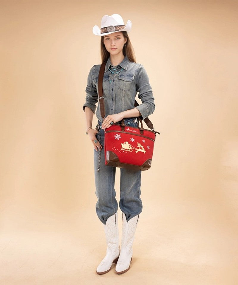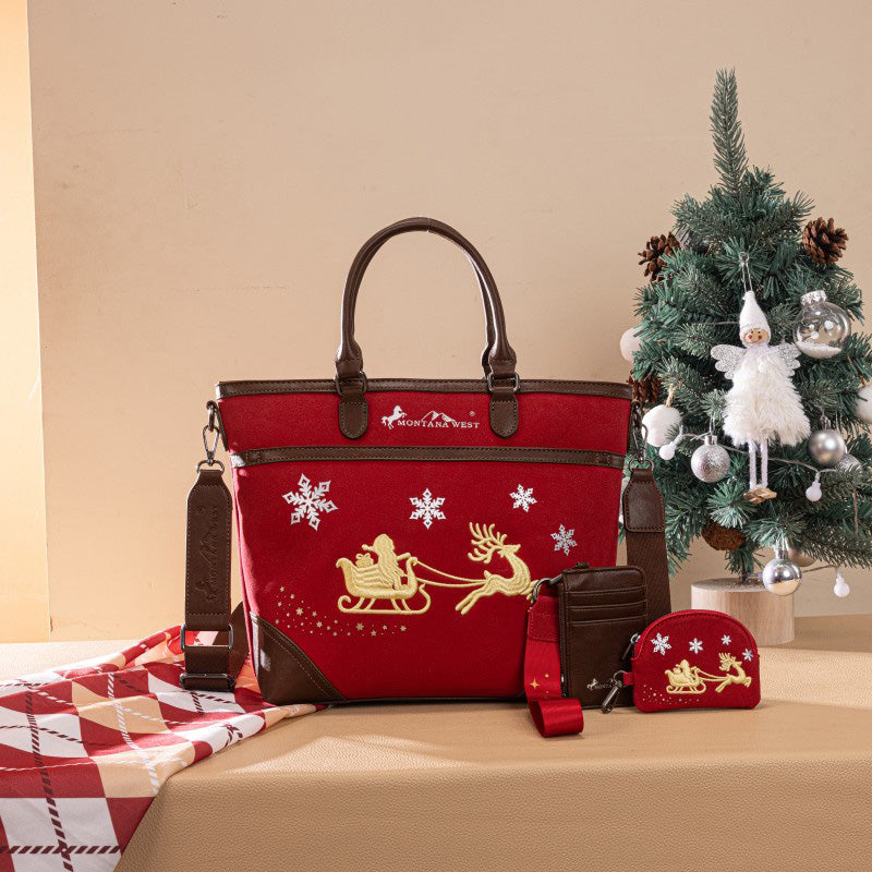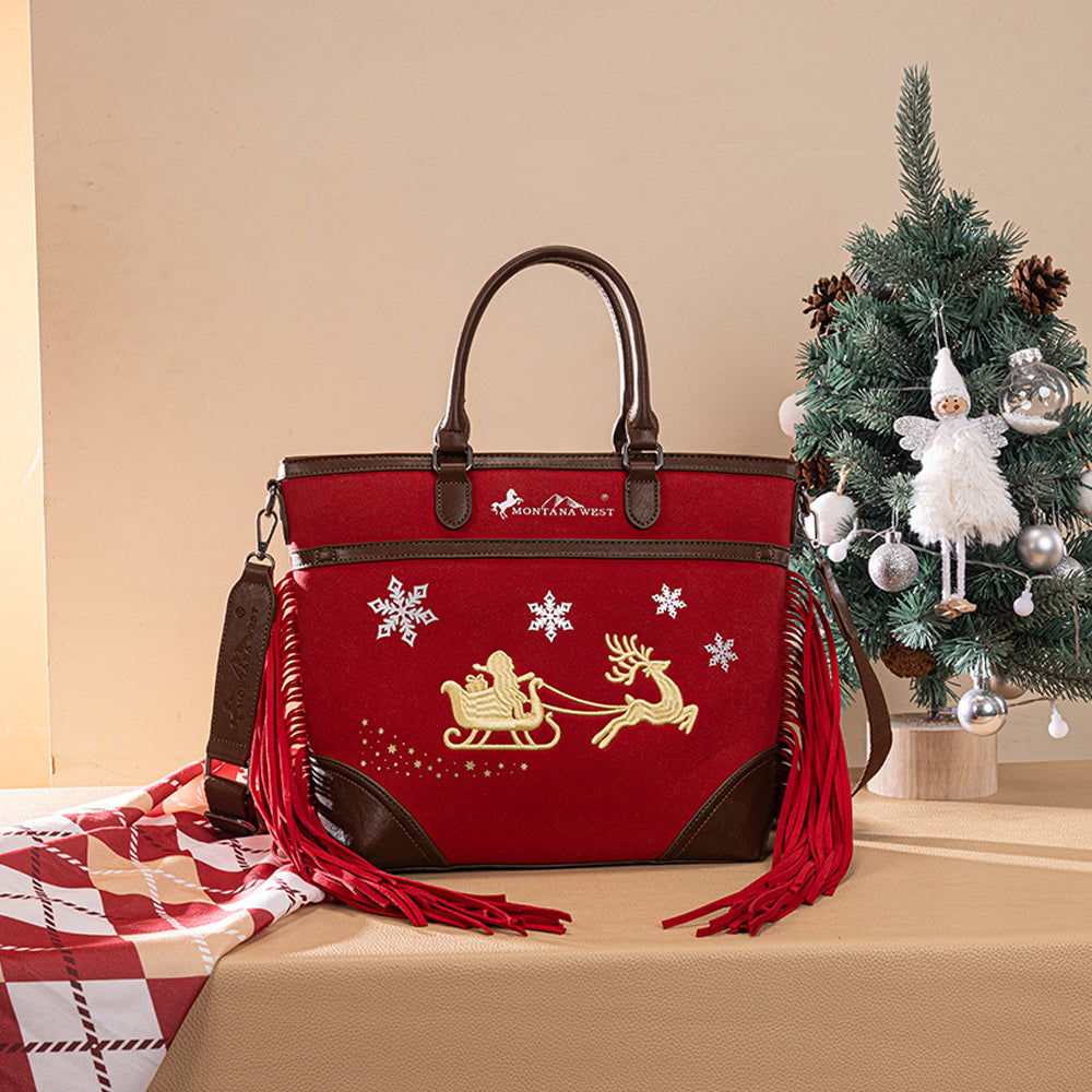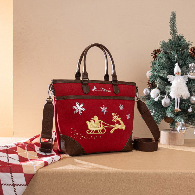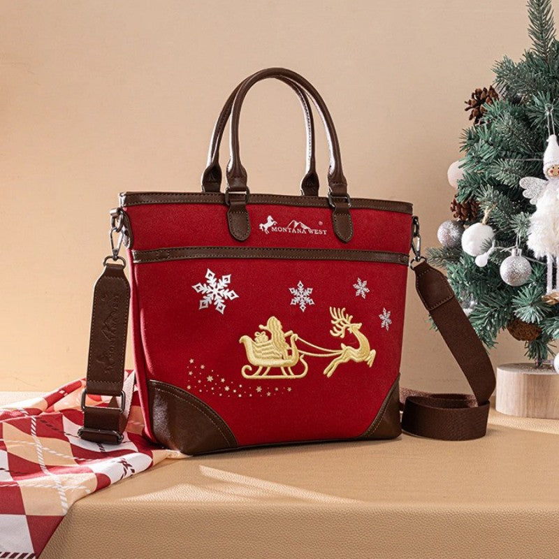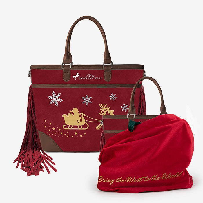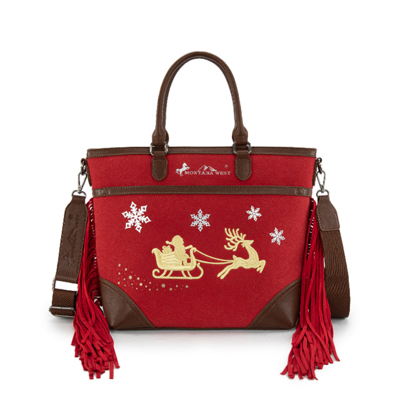 🎅 Ride into the Holidays in true Western style with this exclusive Christmas tote bag from Montana West. Crafted in a classic red suede texture with rich brown leather handles, this holiday handbag features intricate golden Santa & reindeer sleigh embroidery, delicate snowflakes, and a sprinkle of golden stars—bringing festive cheer to your wardrobe.