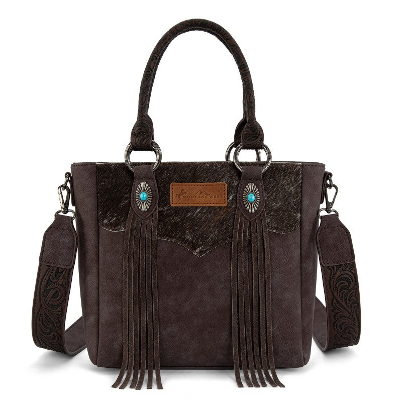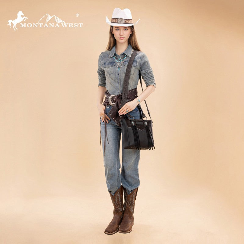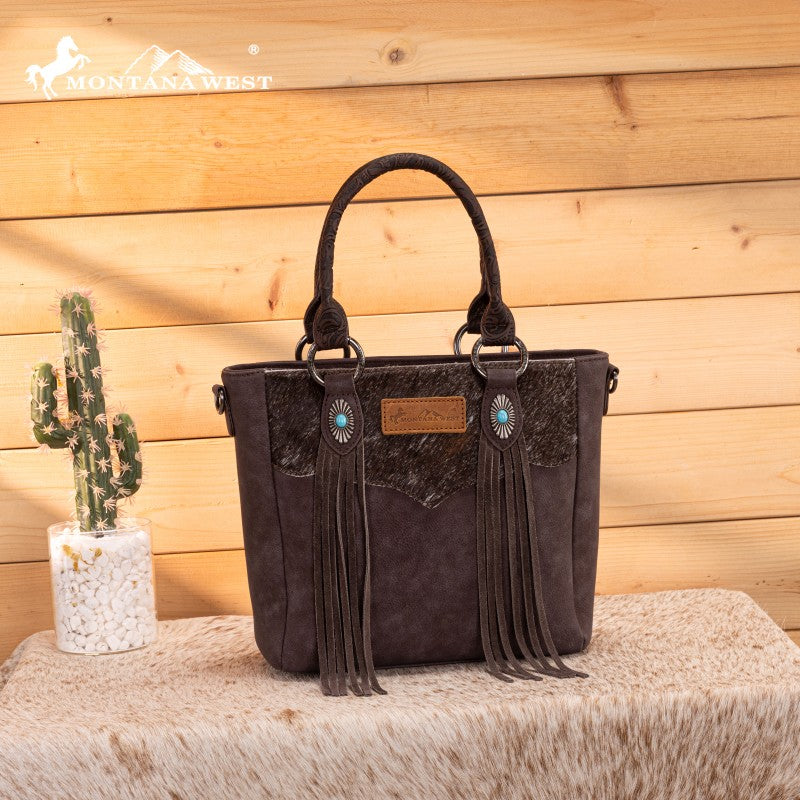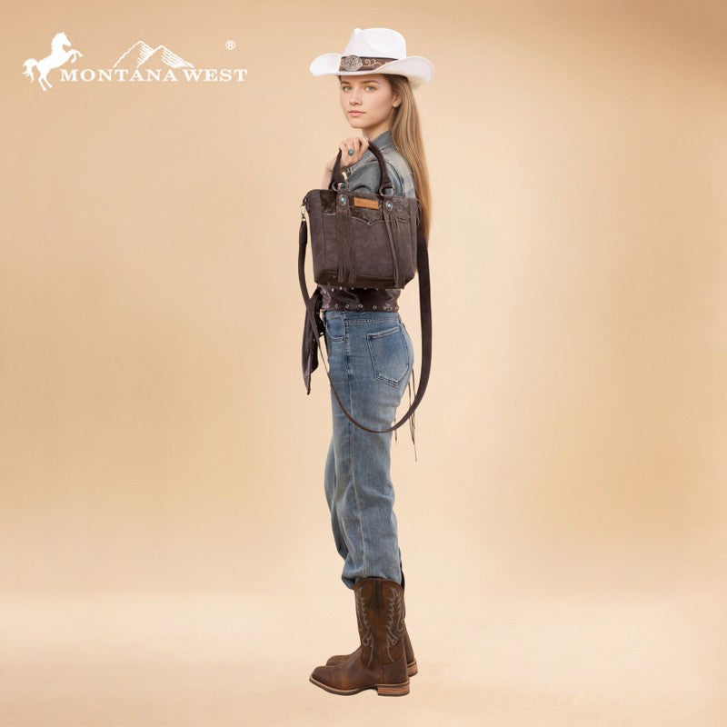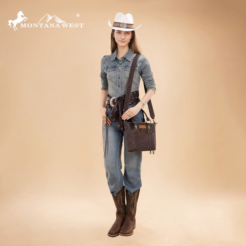 The Montana West Western Fringe Bag combines authentic western style with everyday functionality. Crafted from faux leather with a hair-on-hide texture, it features hand-tooled handles and turquoise conchos. Western fringe details add movement and rustic charm.