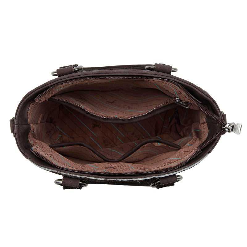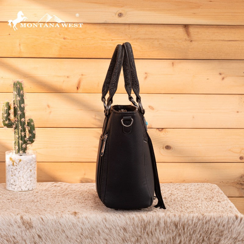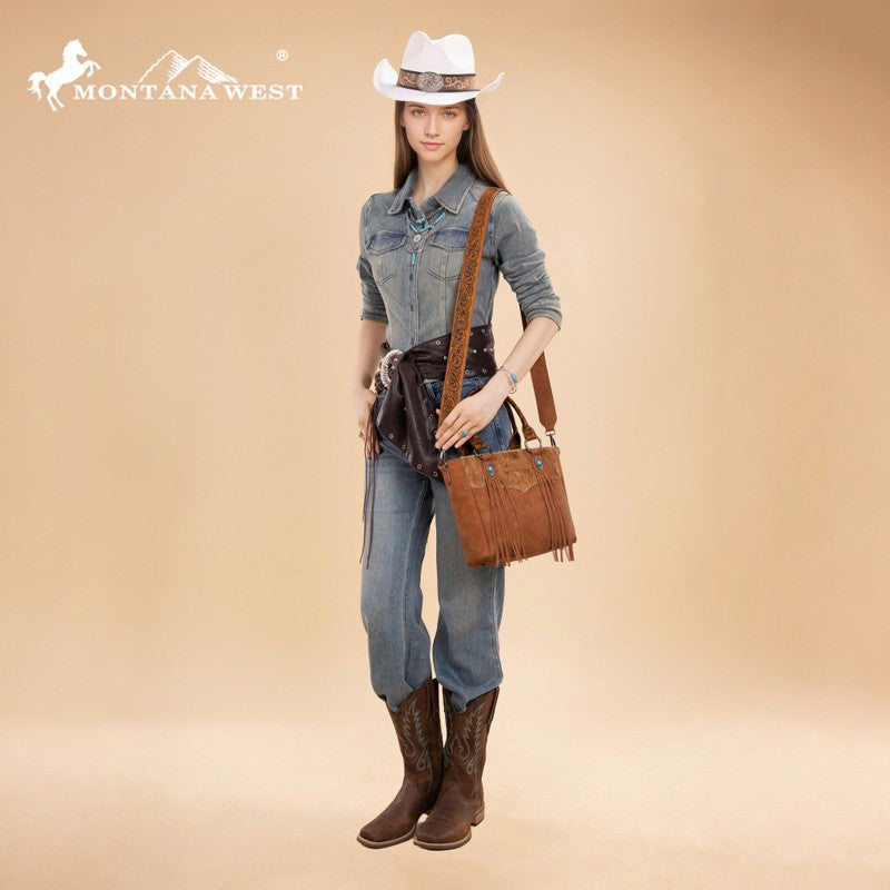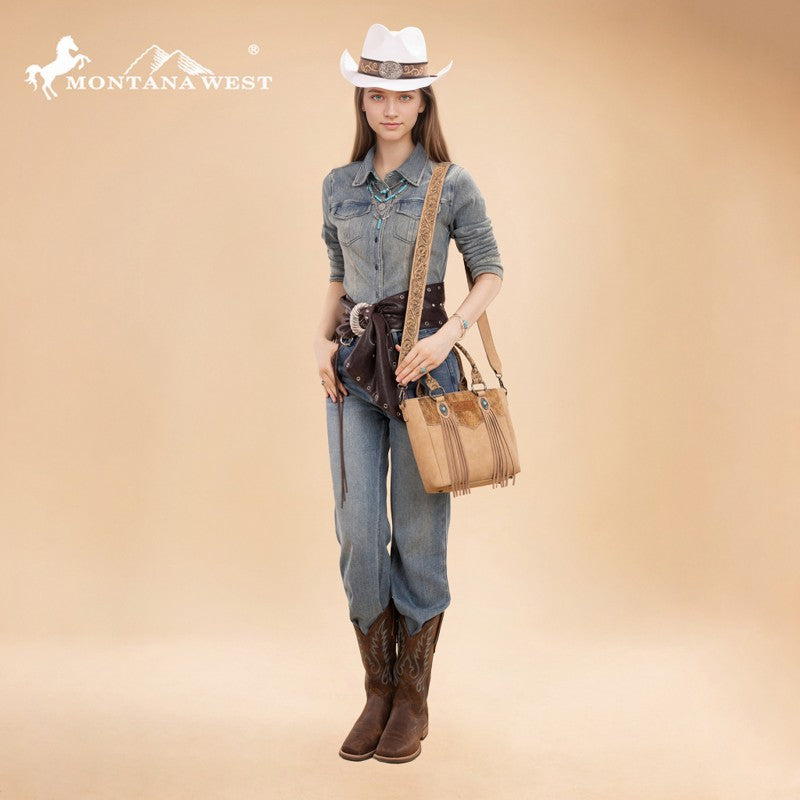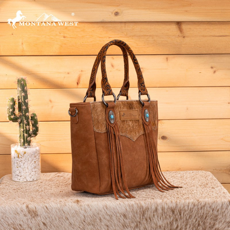 The Montana West Western Fringe Bag combines authentic western style with everyday functionality. Crafted from faux leather with a hair-on-hide texture, it features hand-tooled handles and turquoise conchos. Western fringe details add movement and rustic charm.