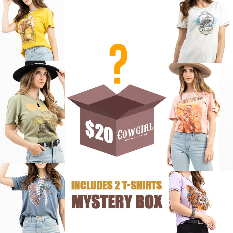 Dive into the excitement of surprise fashion with our Mystery T-Shirt Box! For just $20, receive two premium-quality tees, each featuring unique designs that embody the spirit of the West. Whether it's bold graphics or classic styles, every box is a delightful surprise.