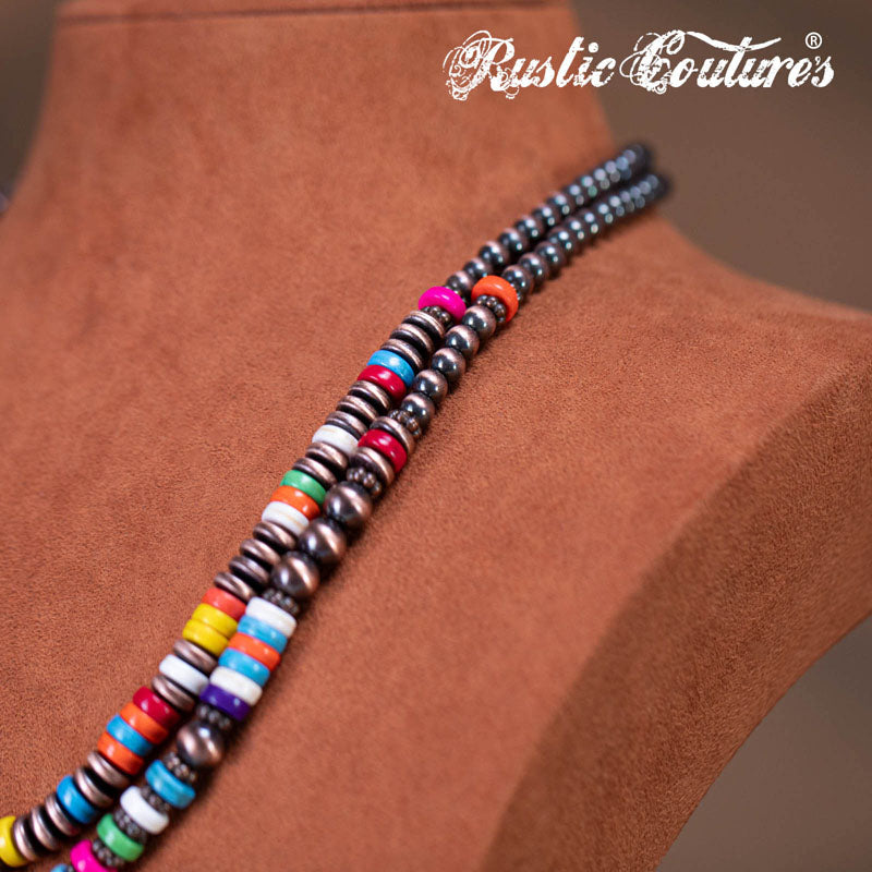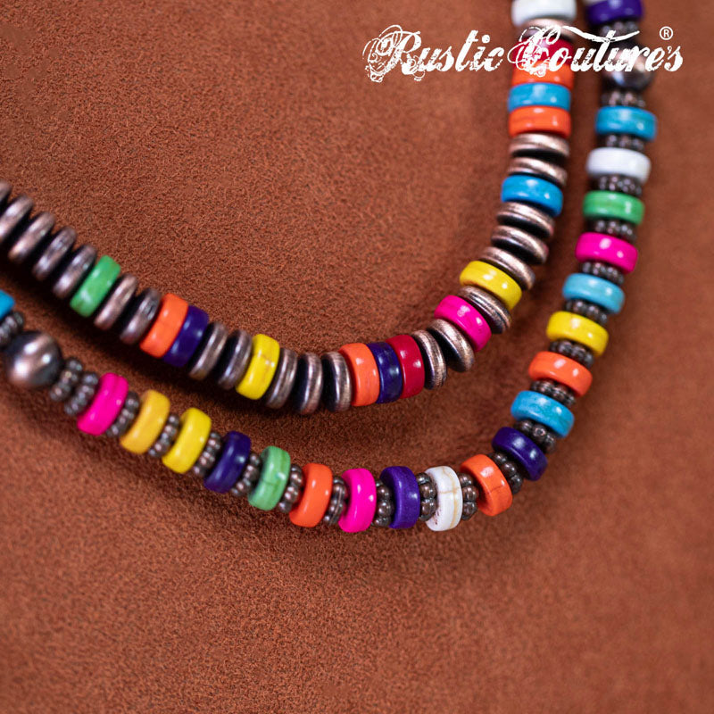 Design: Multi-strand silver-tone beads with turquoise/hot pink stones