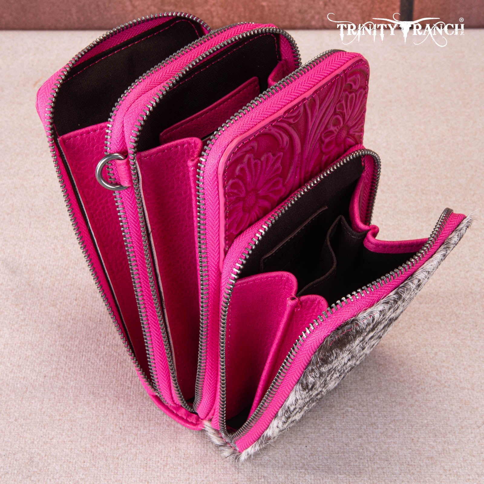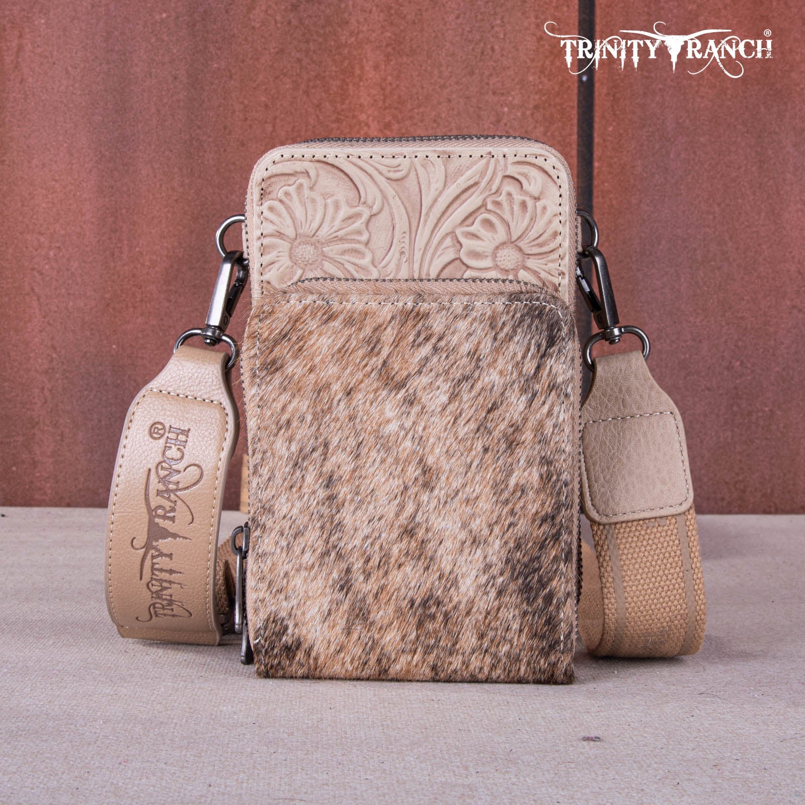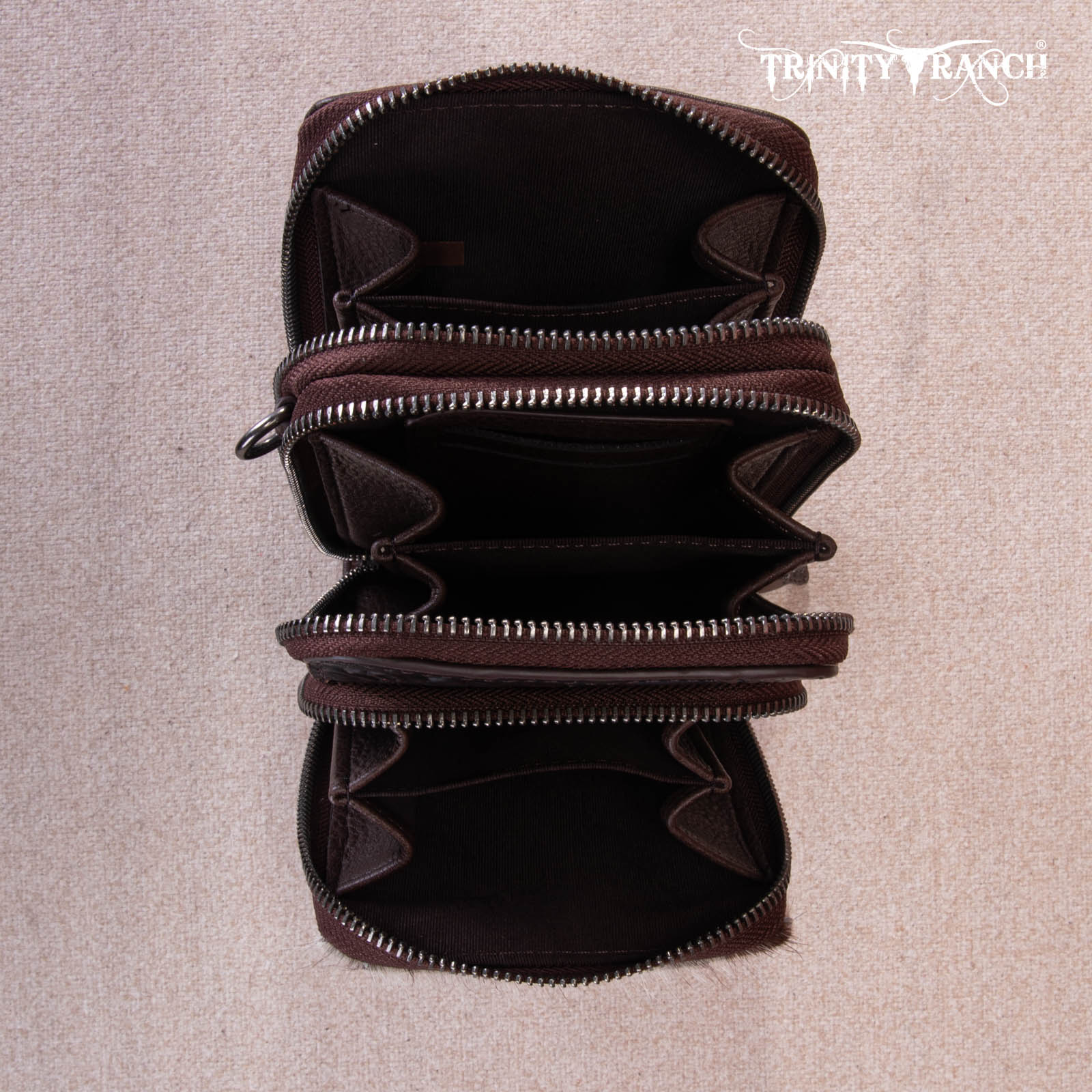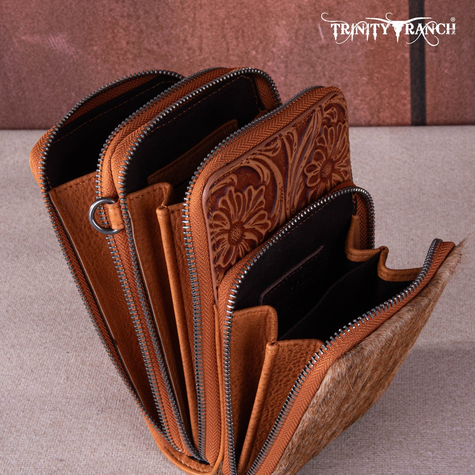 Trinity Ranch line by Montana West, this partial genuine leather phone wallet crossbody has: