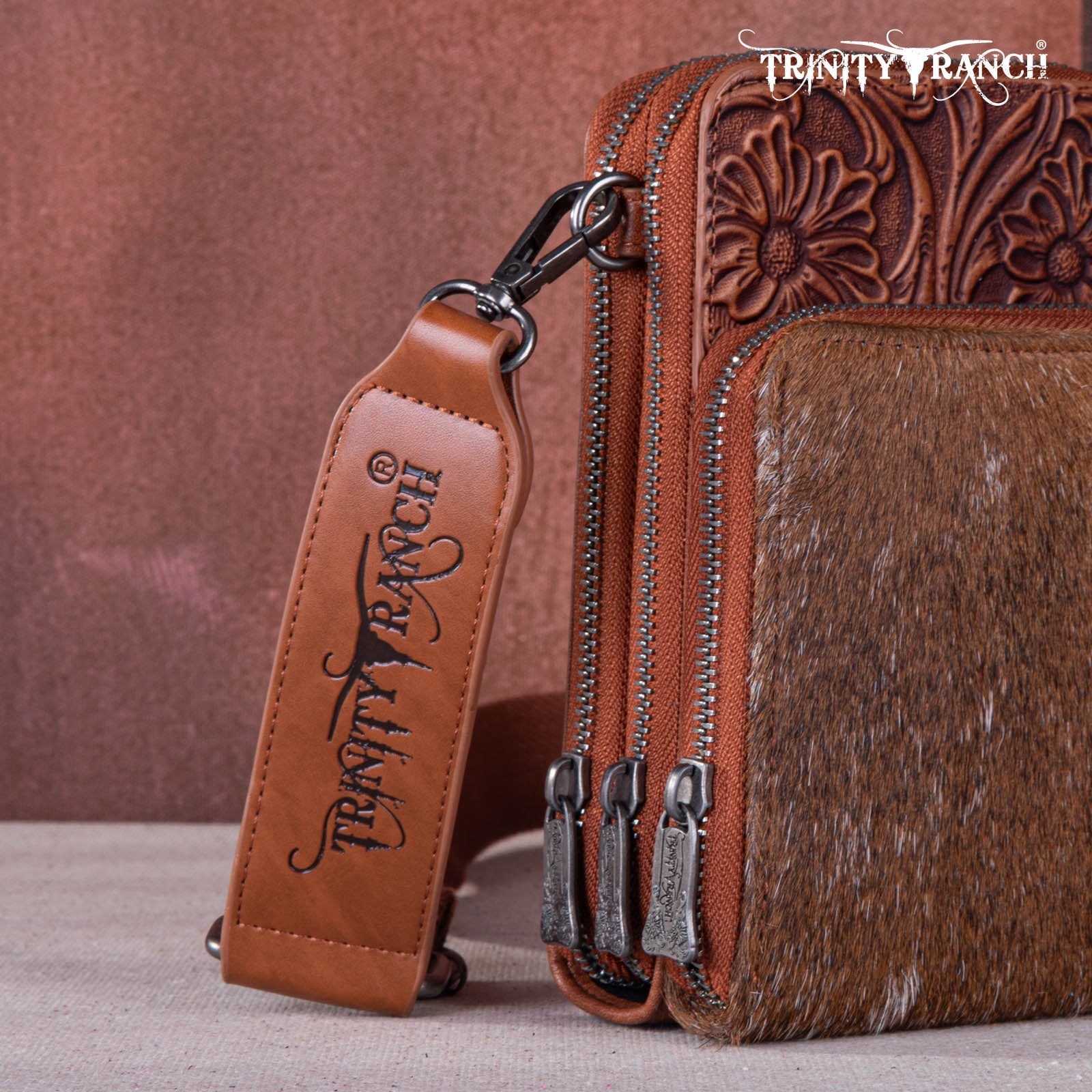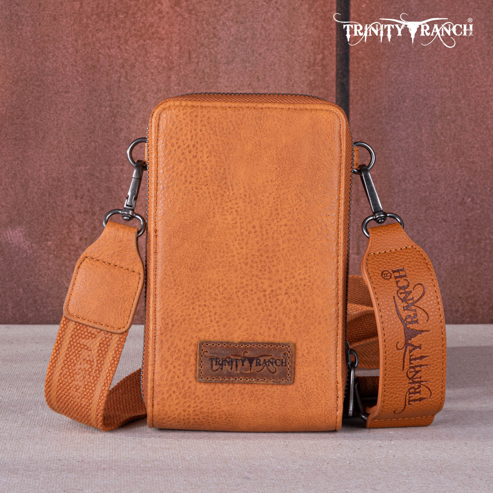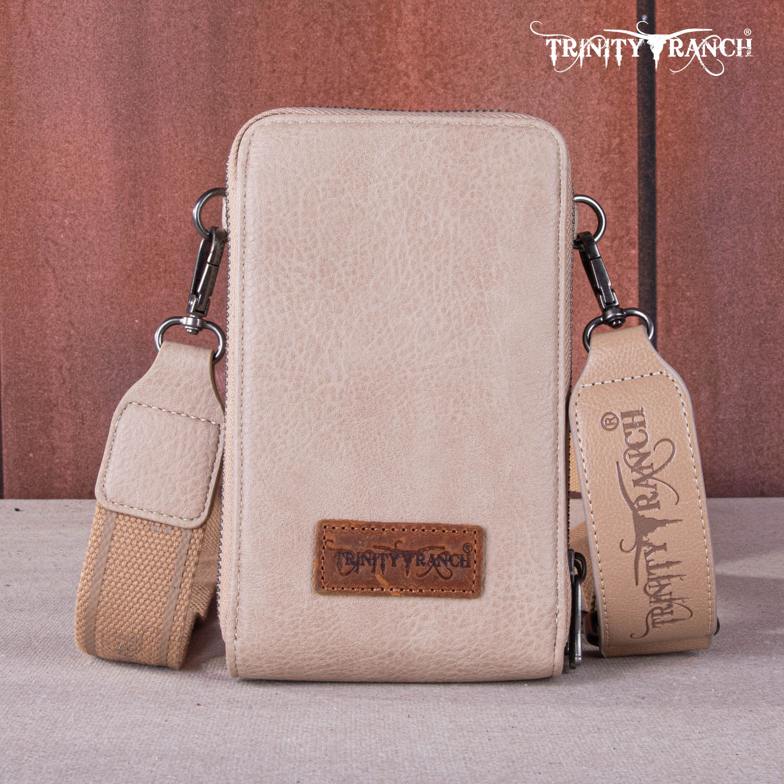 Trinity Ranch line by Montana West, this partial genuine leather phone wallet crossbody has: