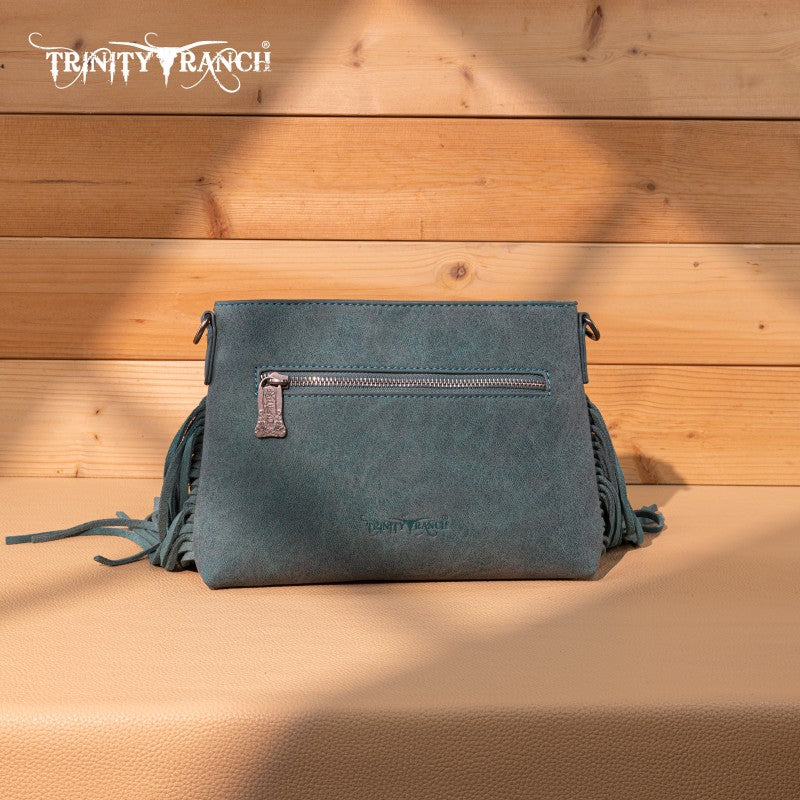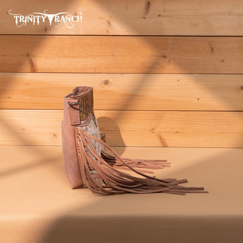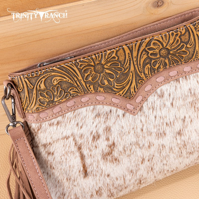 Trinity Ranch line by Montana West, this partial genuine leather crossbody has: