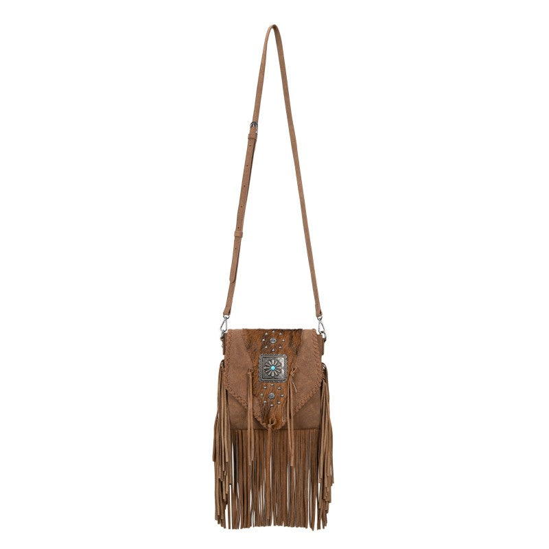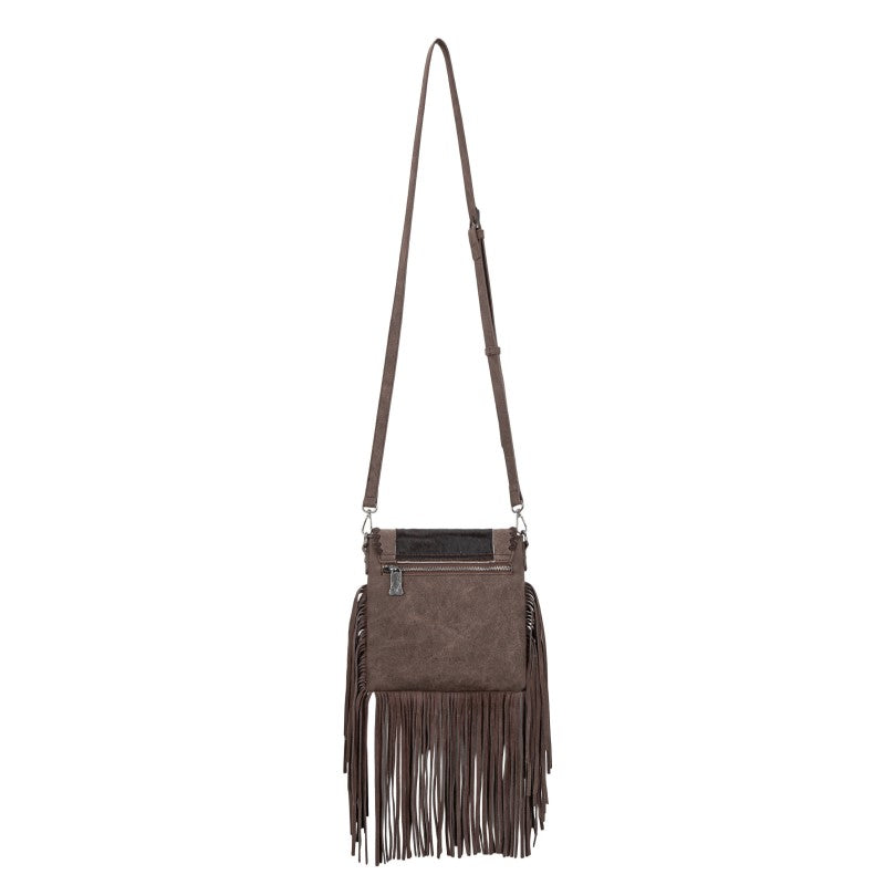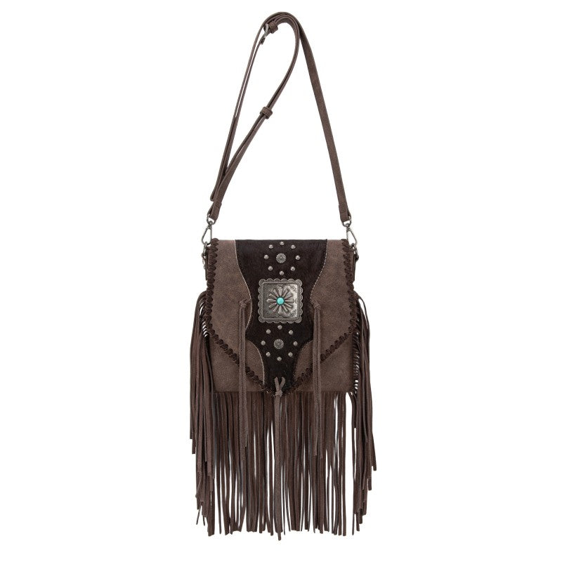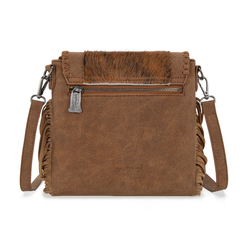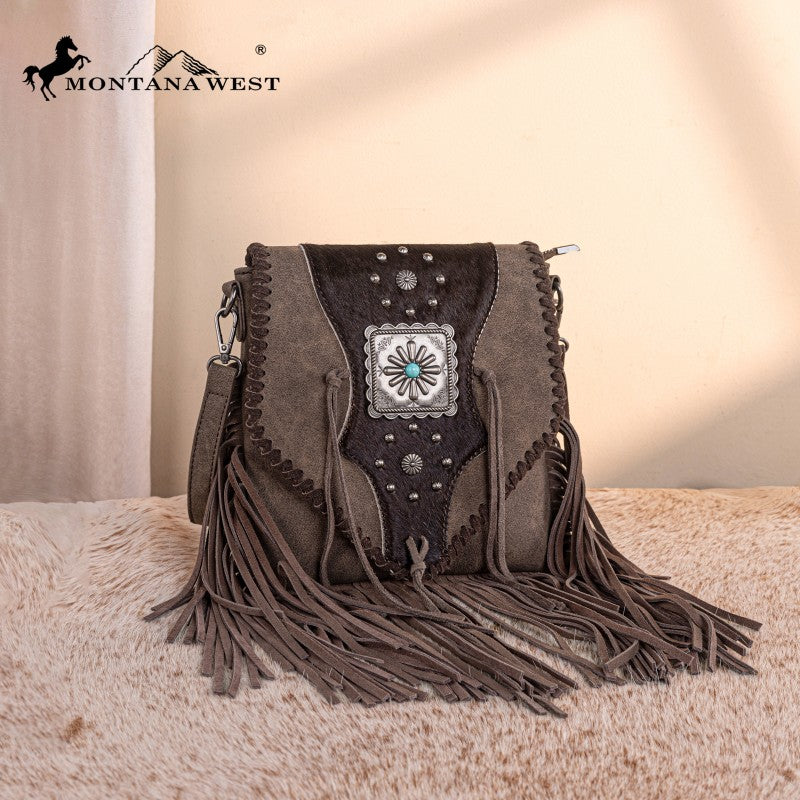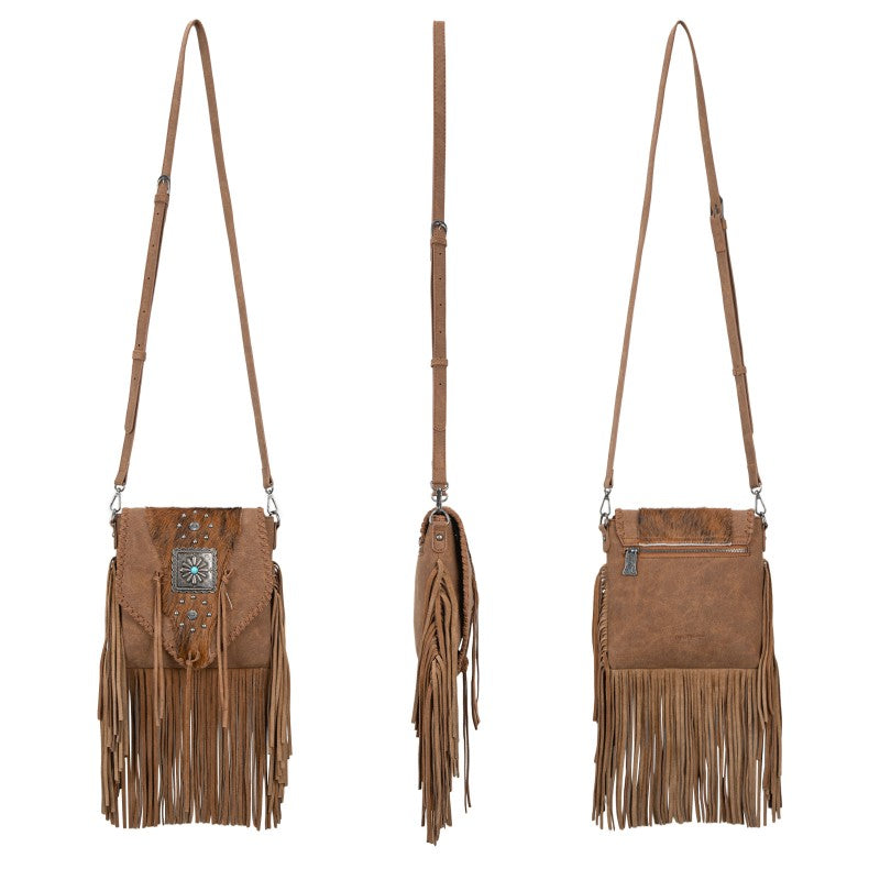 Trinity Ranch line by Montana West, this partial genuine leather crossbody has: