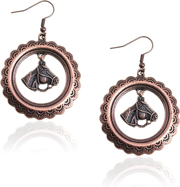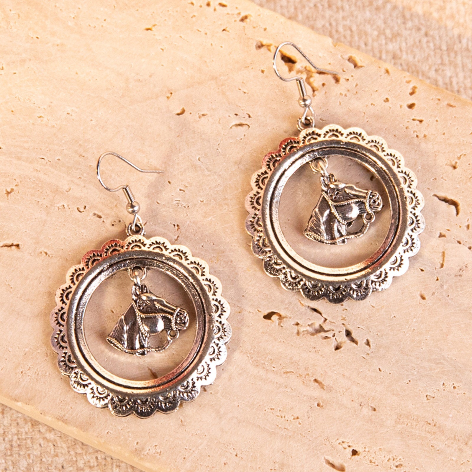 Light Weight Alloy Etched Circle Dangling Horse Head Earring