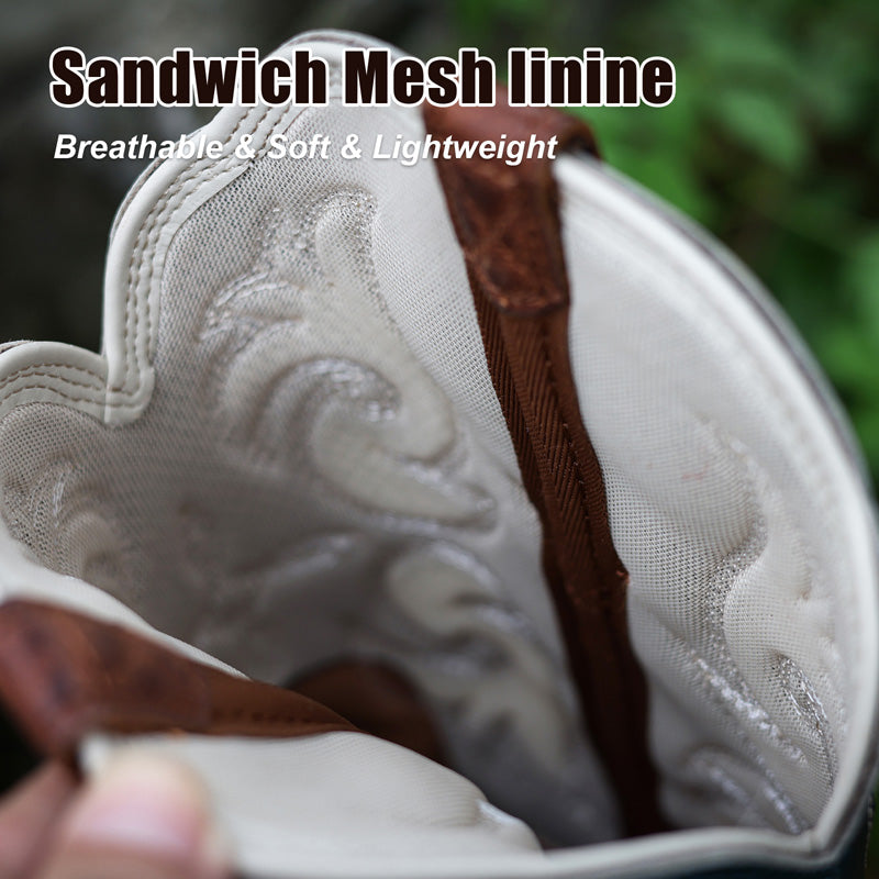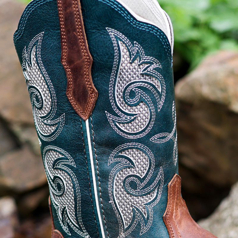 Authentic Western boots for women featuring intricate embroidered designs, breathable mesh panels, and a popular wide square toe profile—all finished with heritage stitch patterns for rugged-yet-refined cowboy style