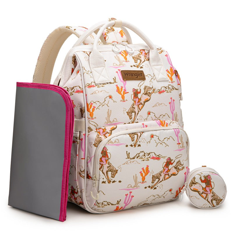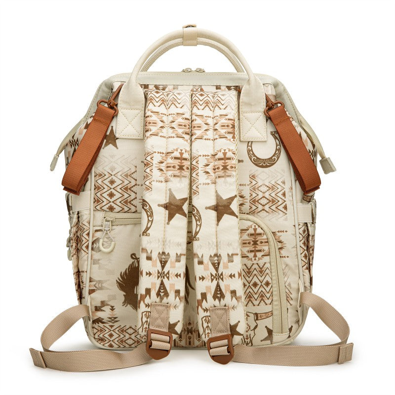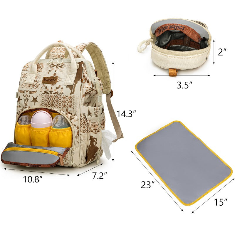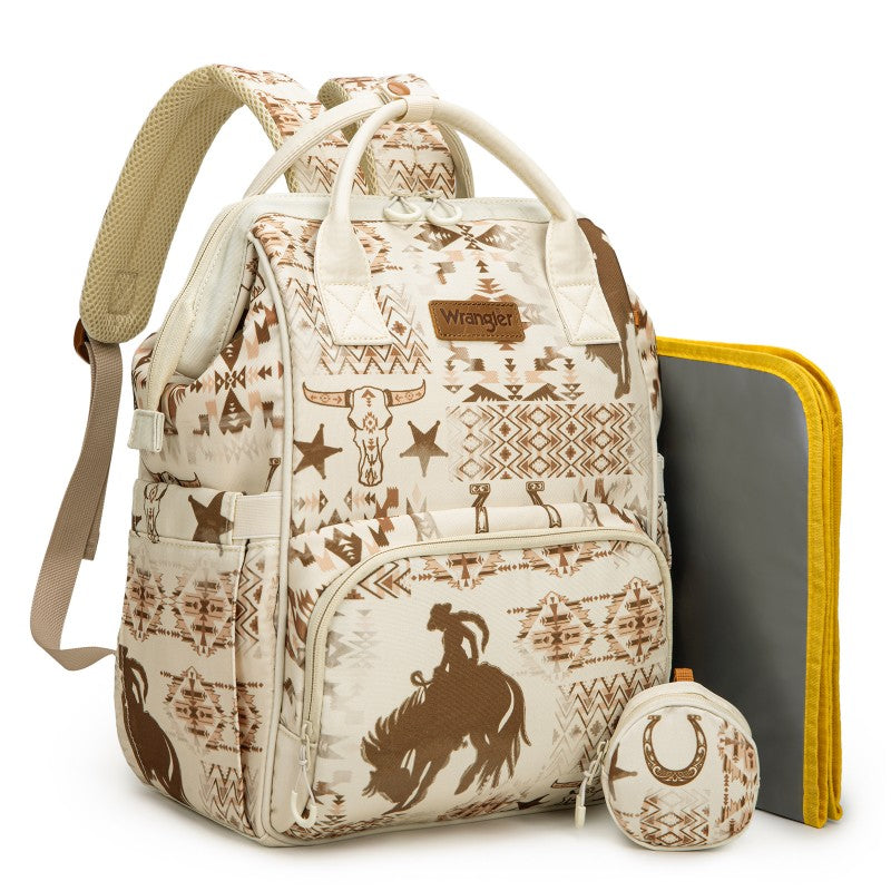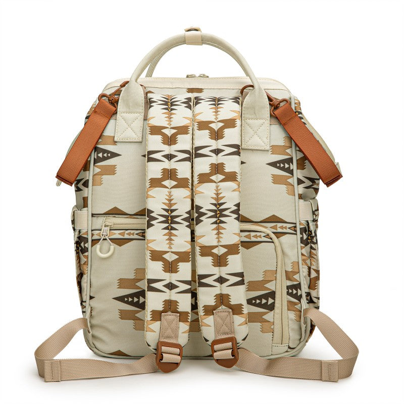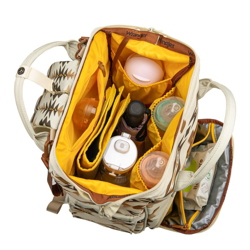 The Wrangler backpack diaper bags combine rugged style and smart functionality for modern parents. Designed with durable canvas, this bag features a geometric tribal pattern and a detachable pouch for quick-access essentials.