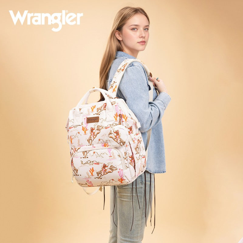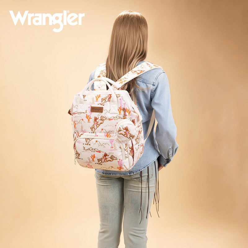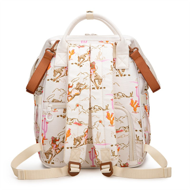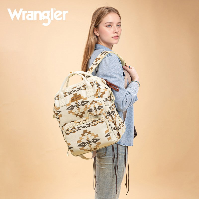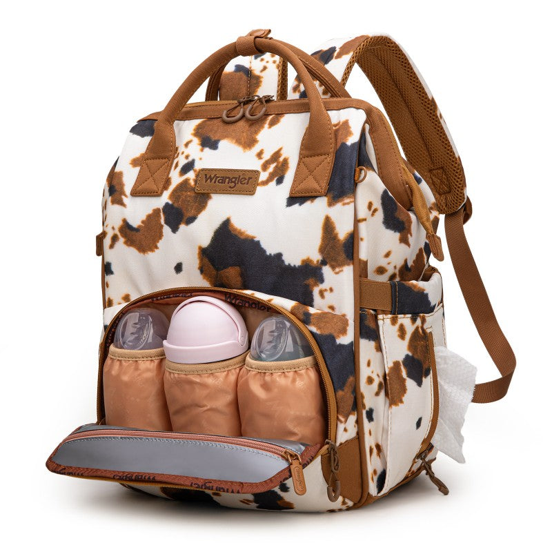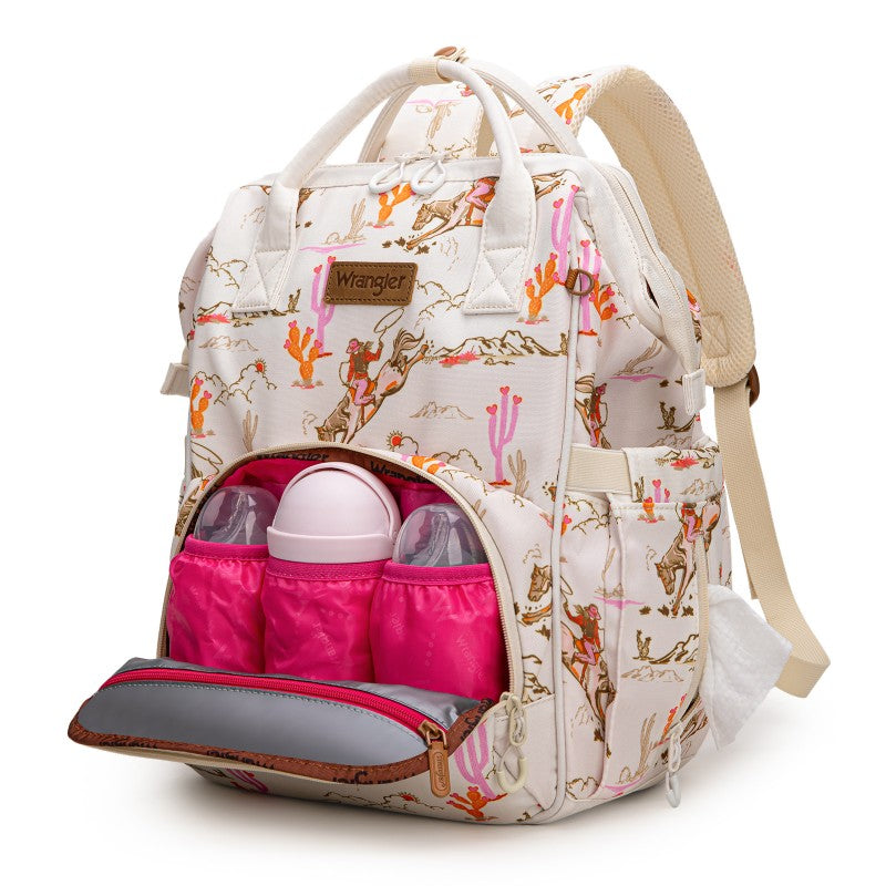 The Wrangler backpack diaper bags combine rugged style and smart functionality for modern parents. Designed with durable canvas, this bag features a geometric tribal pattern and a detachable pouch for quick-access essentials.