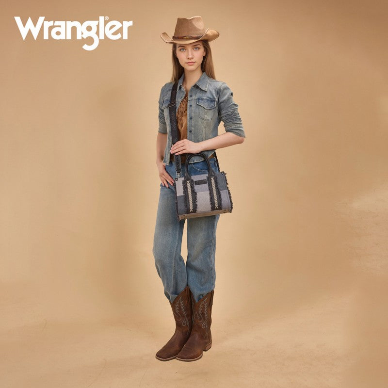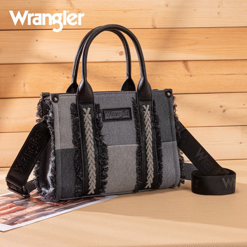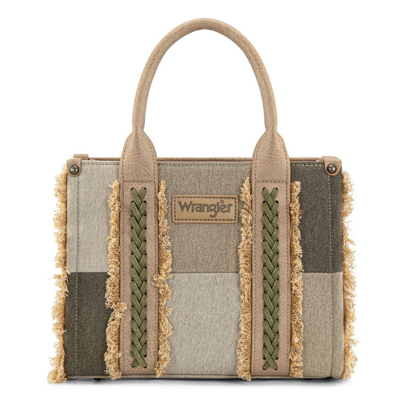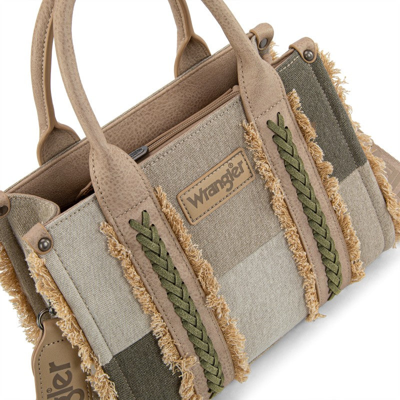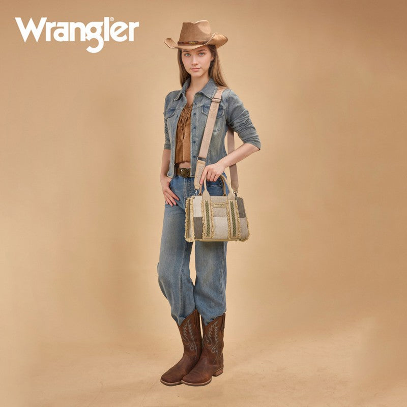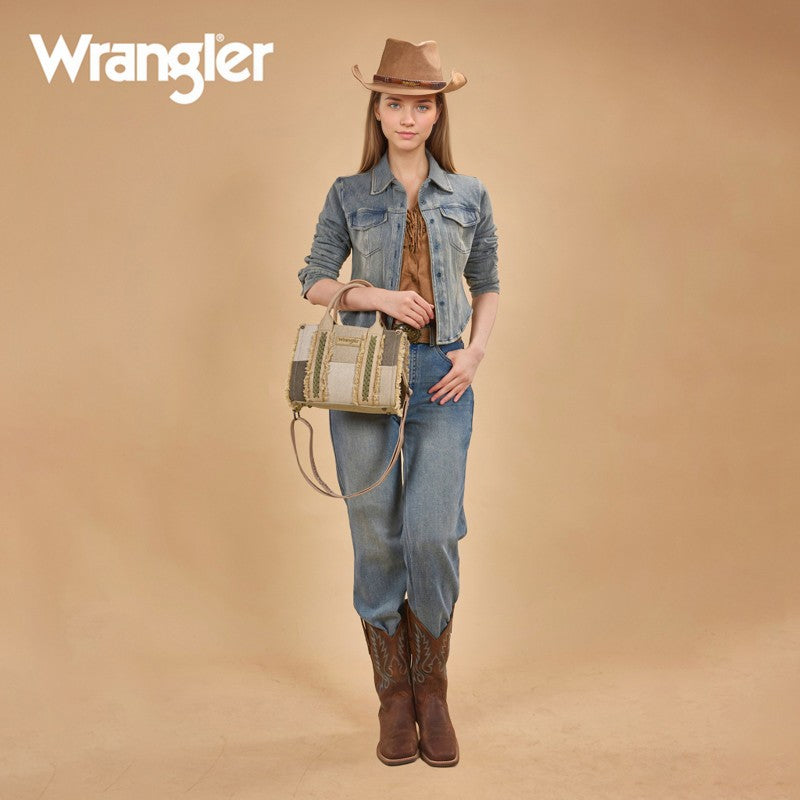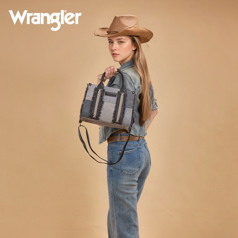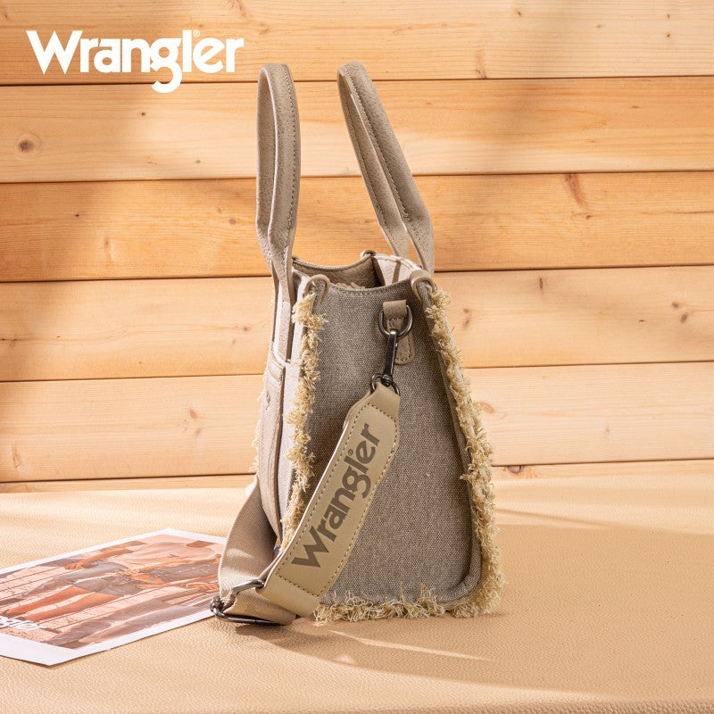 The Wrangler Braided Fringe Tote Bag is a durable, Western-inspired carryall built for everyday use. Crafted from rugged canvas, it features a frayed edge design and an embossed logo on the adjustable shoulder strap.