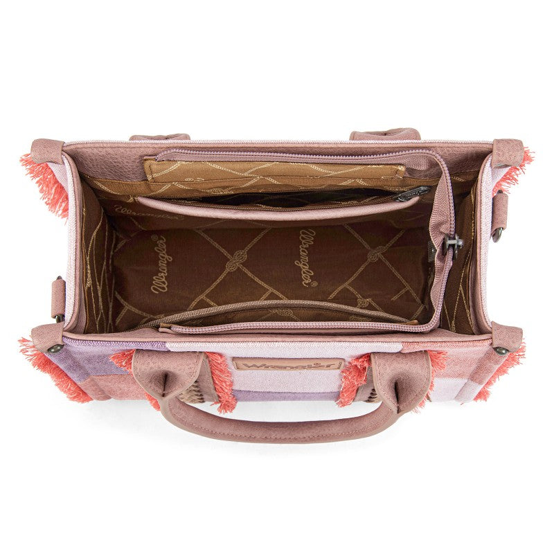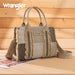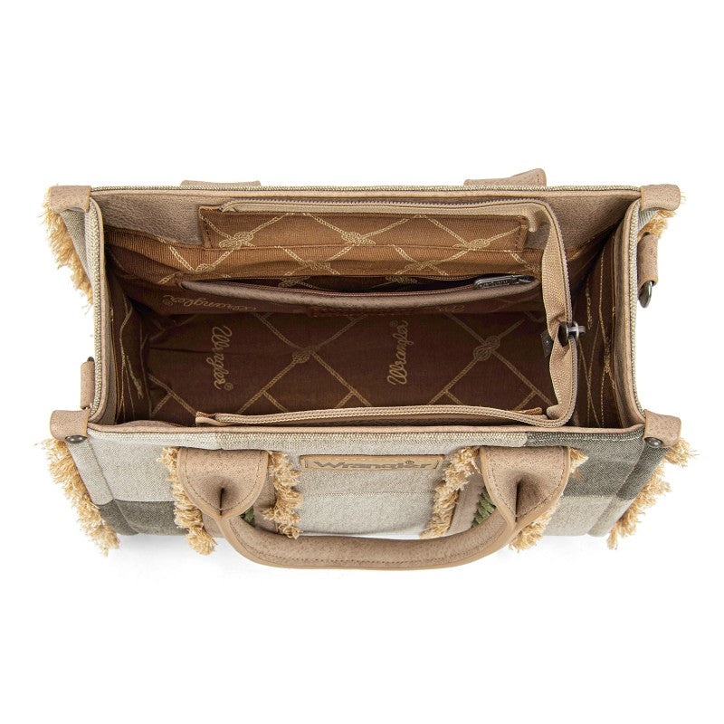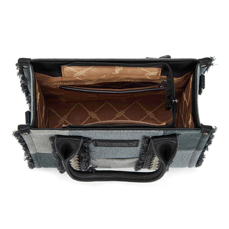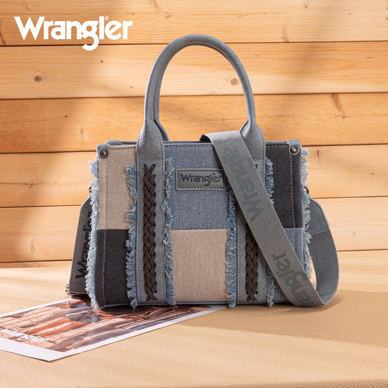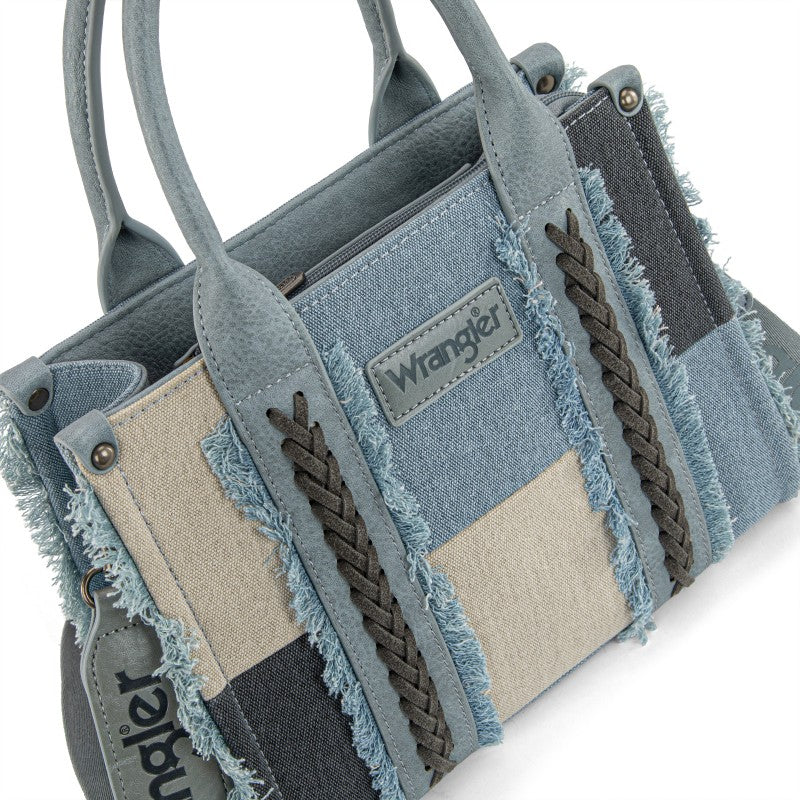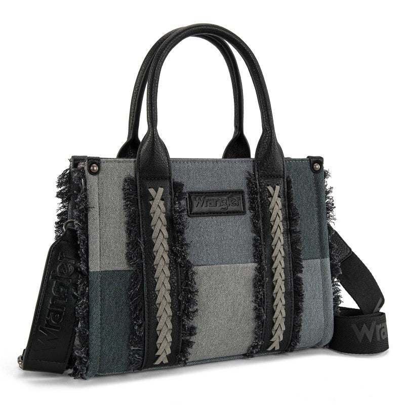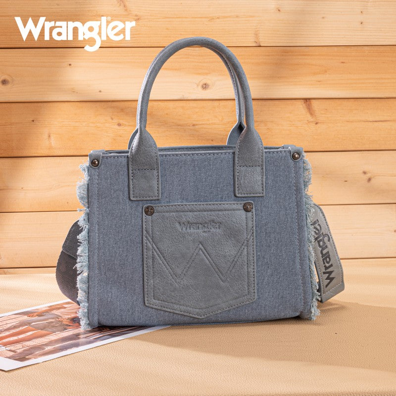 The Wrangler Braided Fringe Tote Bag is a durable, Western-inspired carryall built for everyday use. Crafted from rugged canvas, it features a frayed edge design and an embossed logo on the adjustable shoulder strap.