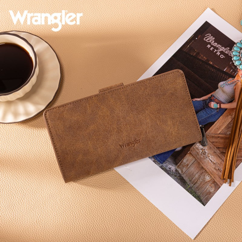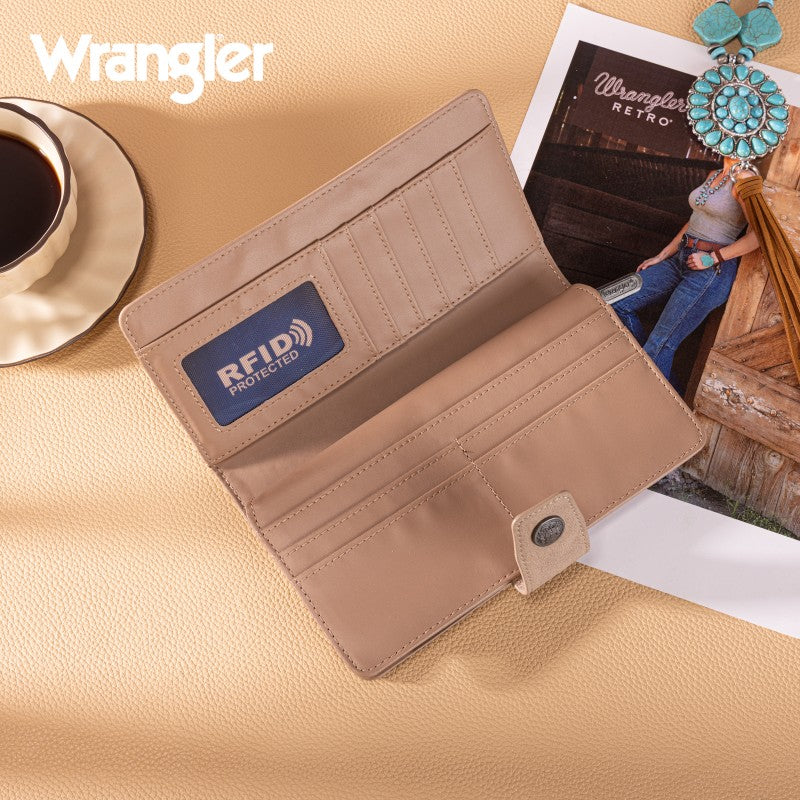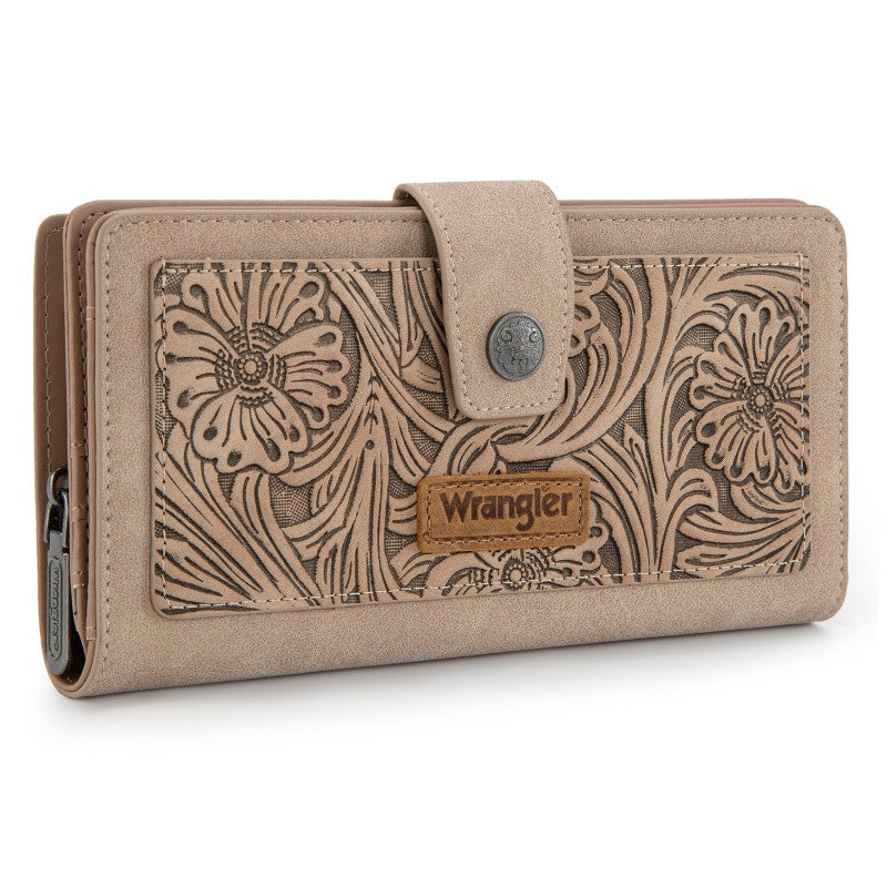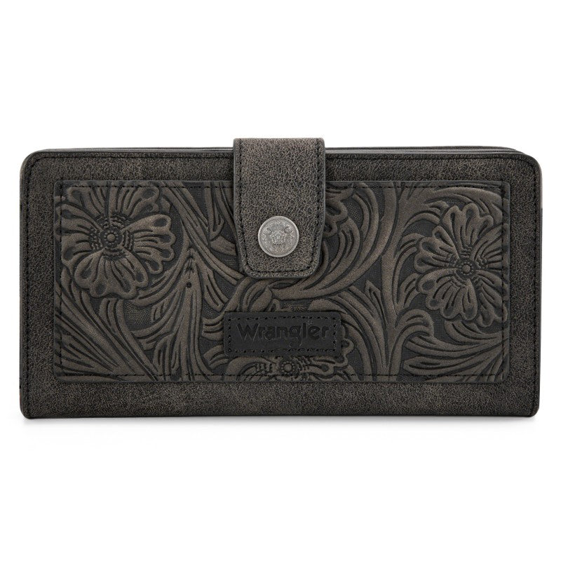 The Wrangler floral bifold wallet combines Western charm with modern function. Crafted from synthetic leather, this floral wallet features an embossed floral pattern and RFID protection for security.