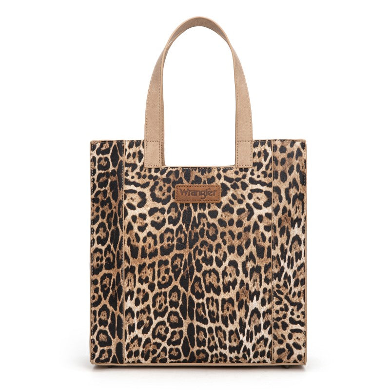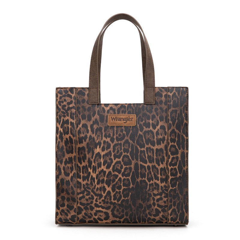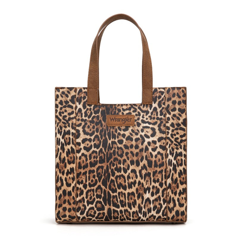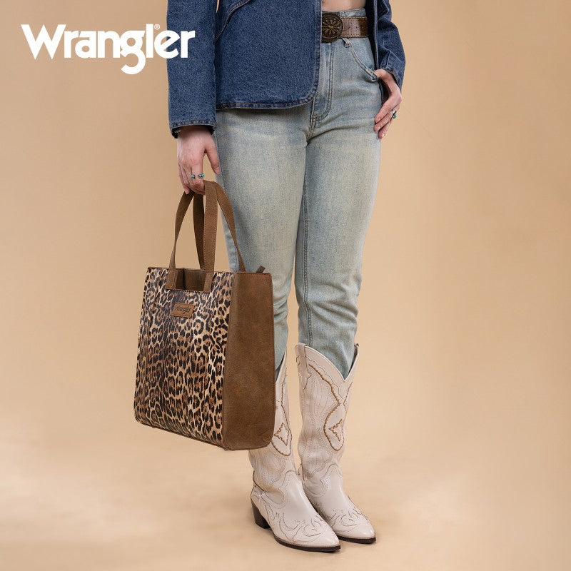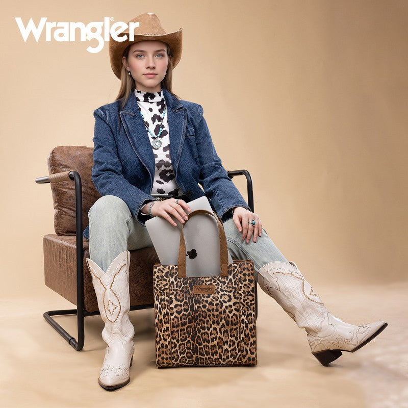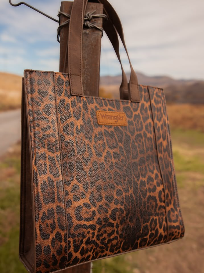 This Wrangler purse showcases a striking leopard print, offering a spacious main compartment for books, tablets, and daily essentials. Designed with dual top handles for versatile carrying, this women’s leopard purse blends bold Western style with practical functionality for everyday use