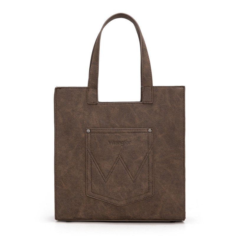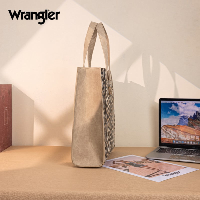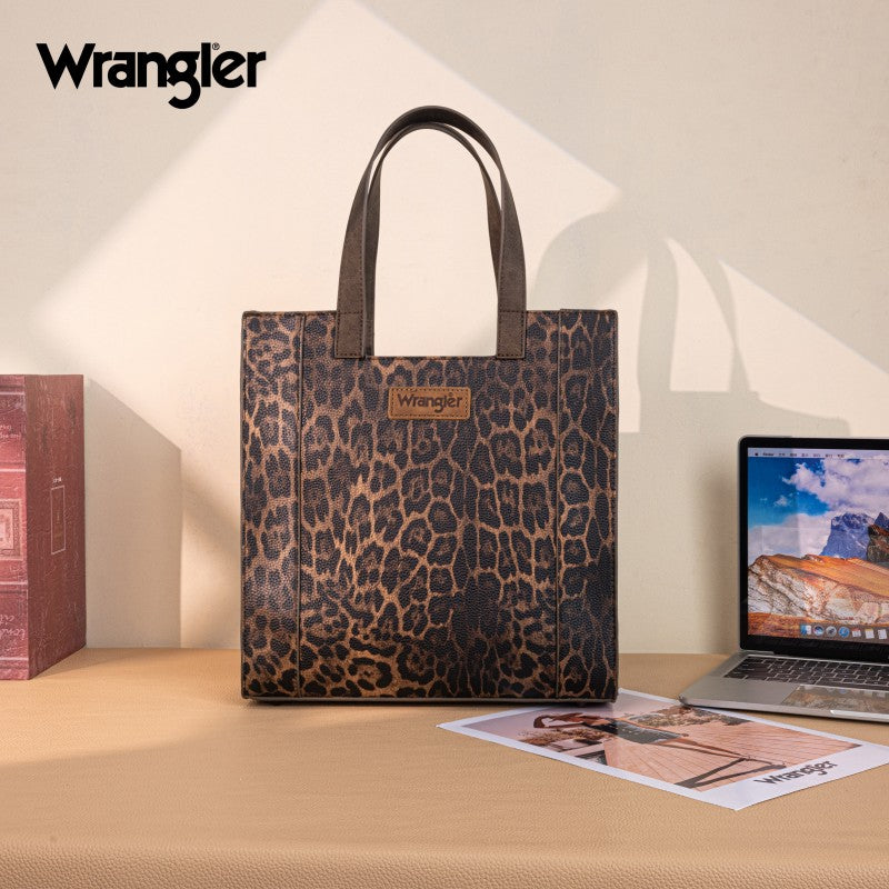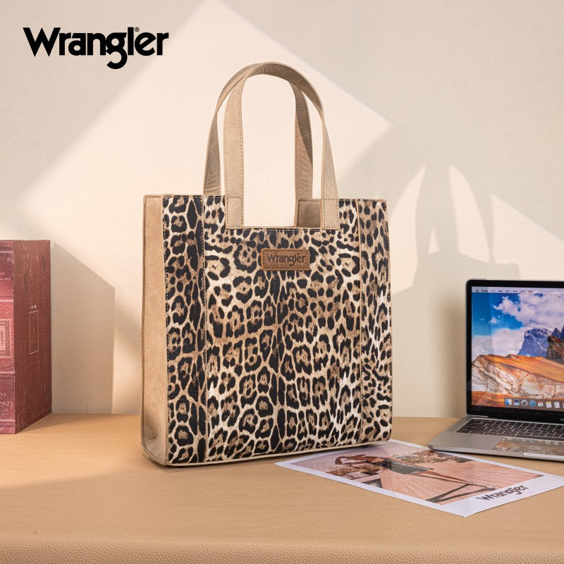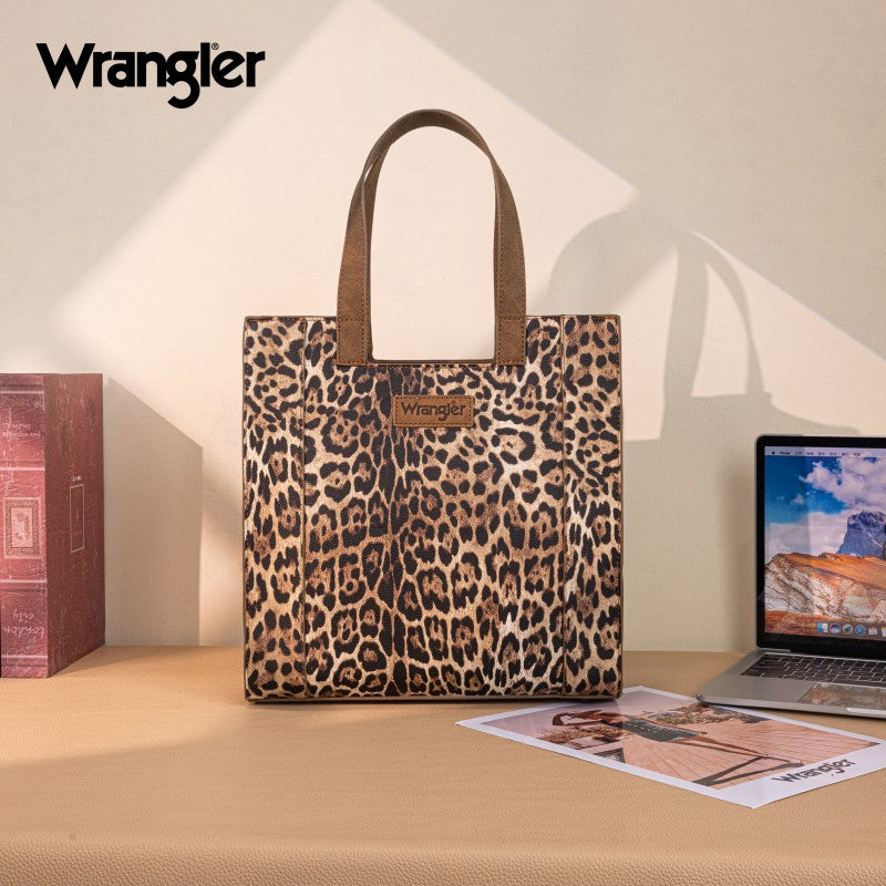 This Wrangler purse showcases a striking leopard print, offering a spacious main compartment for books, tablets, and daily essentials. Designed with dual top handles for versatile carrying, this women’s leopard purse blends bold Western style with practical functionality for everyday use