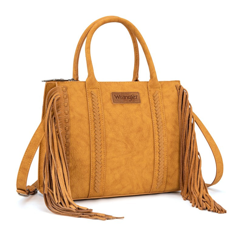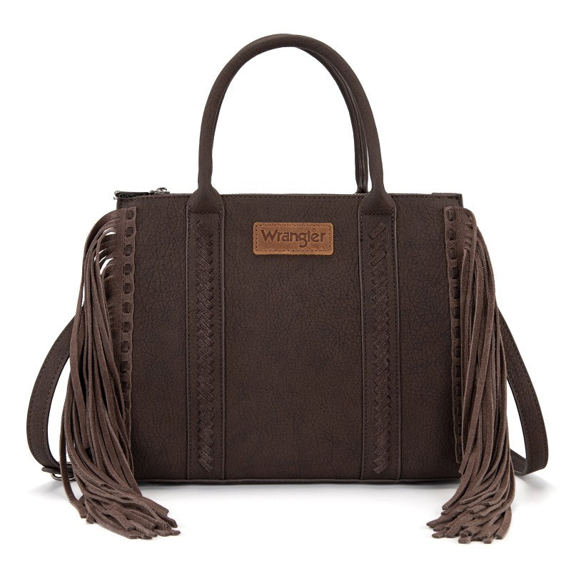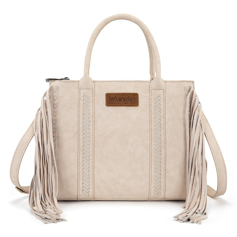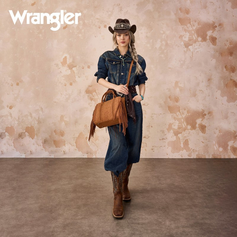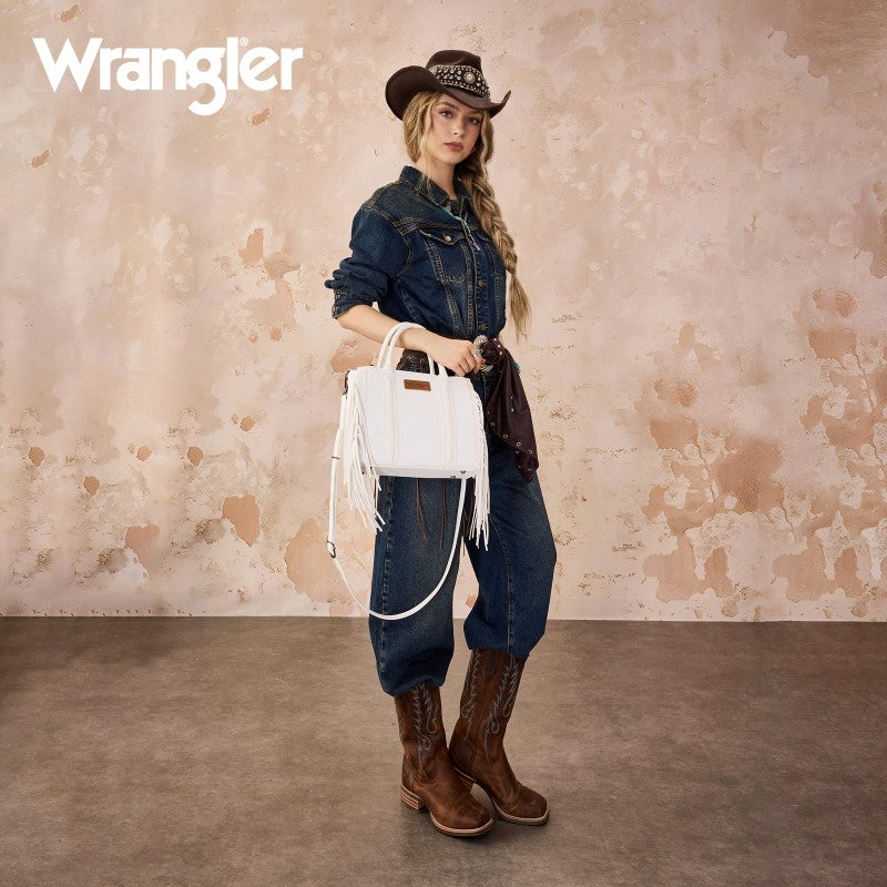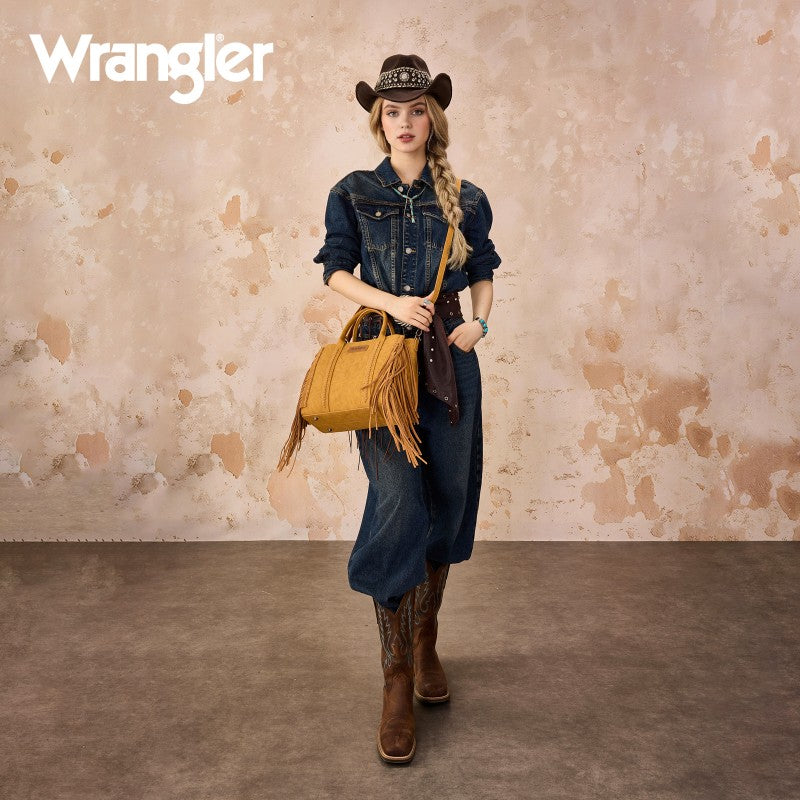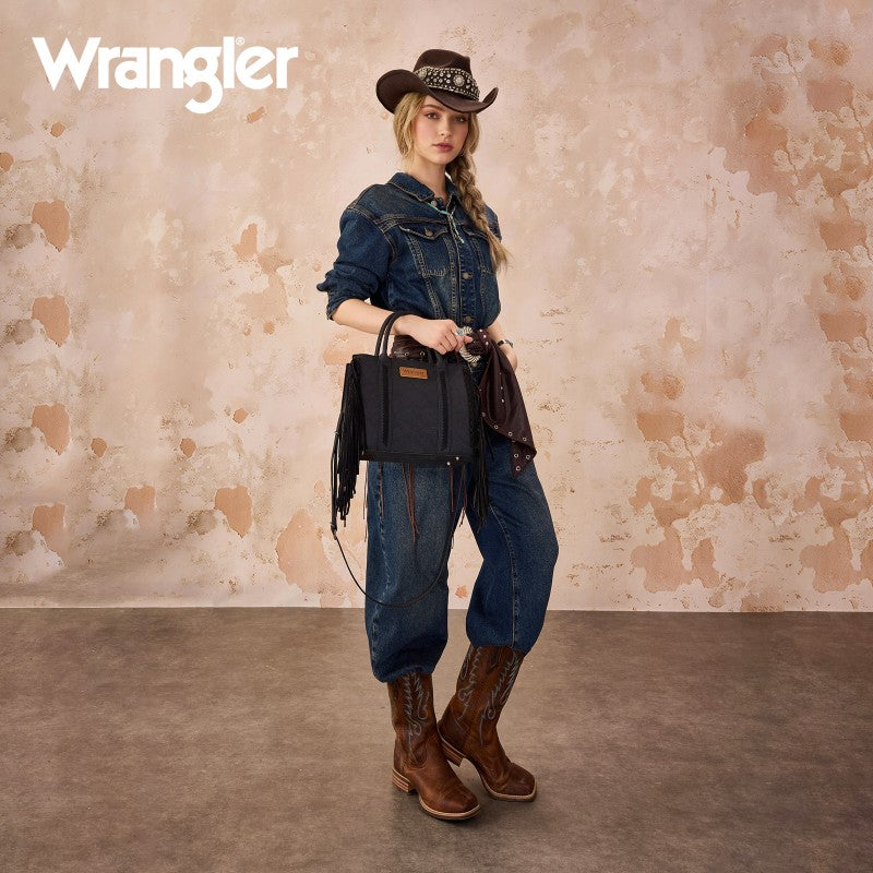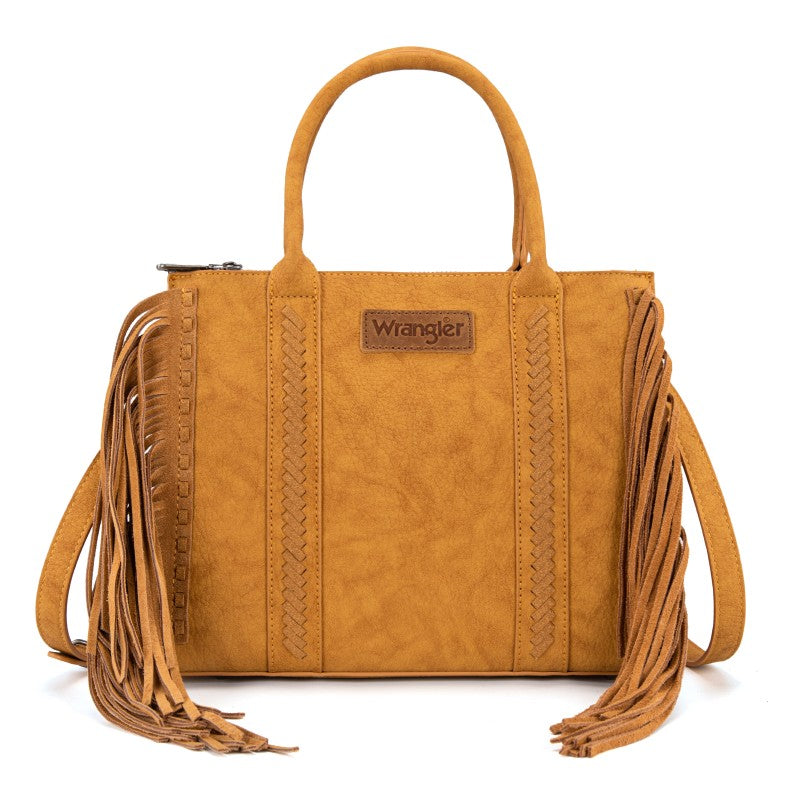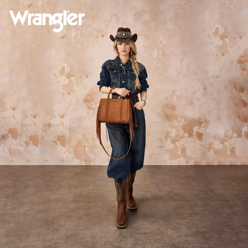 Discover the Wrangler Western Braided Fringe Tote Bag, designed to capture authentic western style with everyday functionality. This structured tote bag features a vintage-inspired PU exterior, signature braided panel detailing, and statement fringe accents along both sides, creating a bold yet balanced silhouette that transitions effortlessly from casual days to weekend outings.