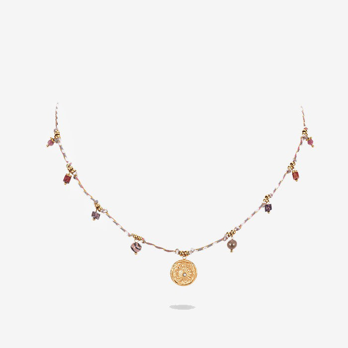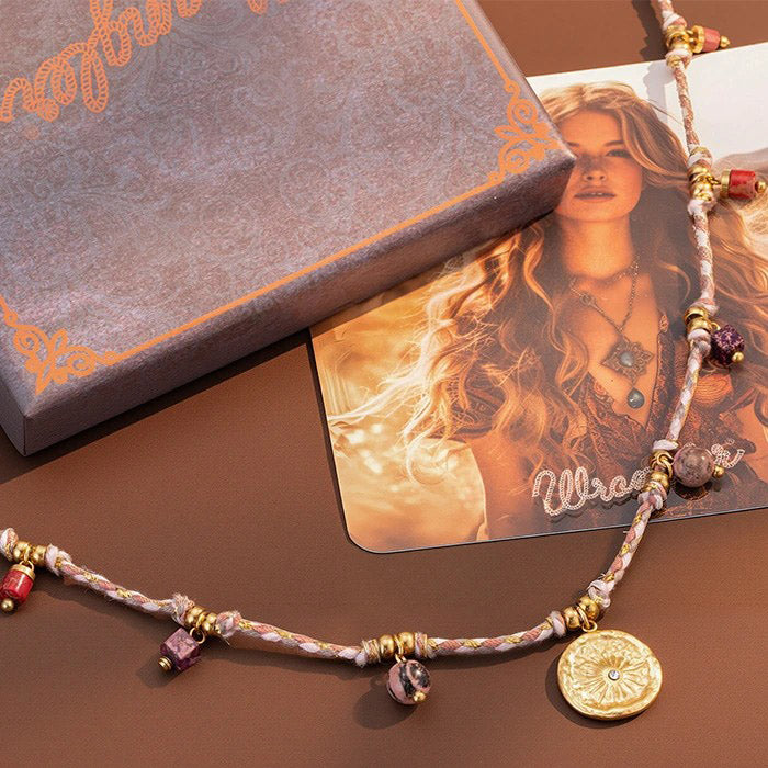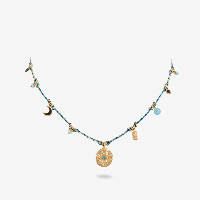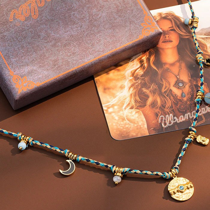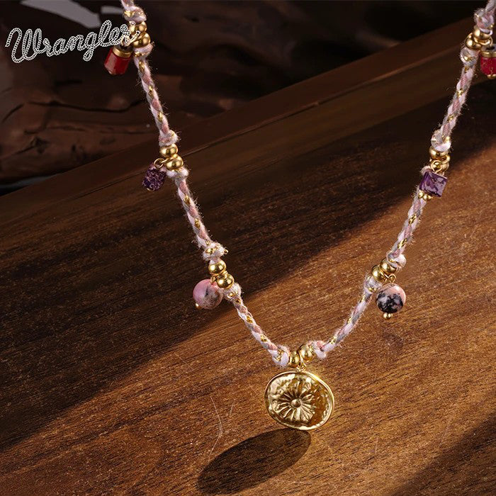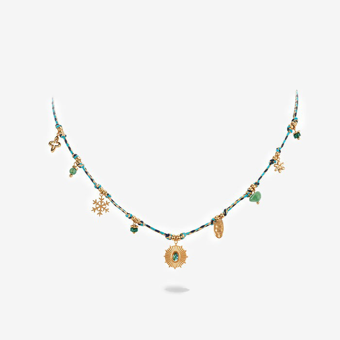 Inspired by the untamed beauty of the American West, this Western Rope Charm Necklace blends rustic charm with radiant symbolism. Hand-braided with turquoise and earth-toned threads, this piece features a medley of golden charms—each representing elements of nature and freedom: a snowflake, a wildflower, a golden leaf, and a radiant sunburst with a shimmering abalone inlay at its center.